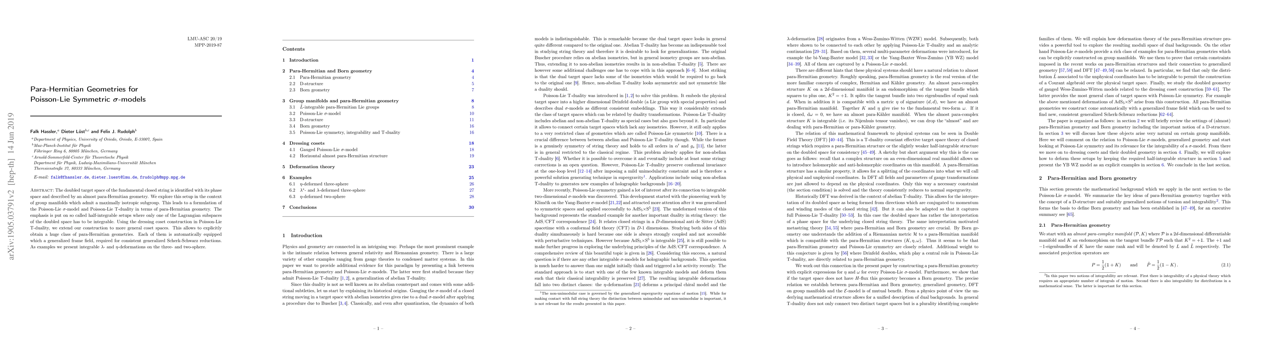 The doubled target space of the fundamental closed string is identified with its phase space and described by an almost para-Hermitian geometry. We explore this setup in the context of group manifolds which admit a maximally isotropic subgroup. This leads to a formulation of the Poisson-Lie $\sigma$-model and Poisson-Lie T-duality in terms of para-Hermitian geometry. The emphasis is put on so called half-integrable setups where only one of the Lagrangian subspaces of the doubled space has to be integrable. Using the dressing coset construction in Poisson-Lie T-duality, we extend our construction to more general coset spaces. This allows to explicitly obtain a huge class of para-Hermitian geometries. Each of them is automatically equipped which a generalized frame field, required for consistent generalized Scherk-Schwarz reductions. As examples we present integrable $\lambda$- and $\eta$-deformations on the three- and two-sphere.