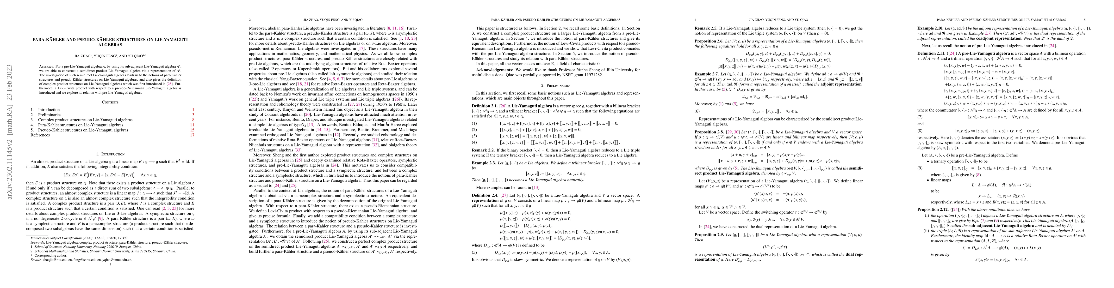 This paper constructs semidirect product Lie-Yamaguti algebras from pre-Lie-Yamaguti algebras and introduces the concepts of para-Kähler and pseudo-Kähler structures on them, along with a Levi-Civita product linked to pseudo-Riemannian structures, relating these to pre-Lie-Yamaguti algebras.