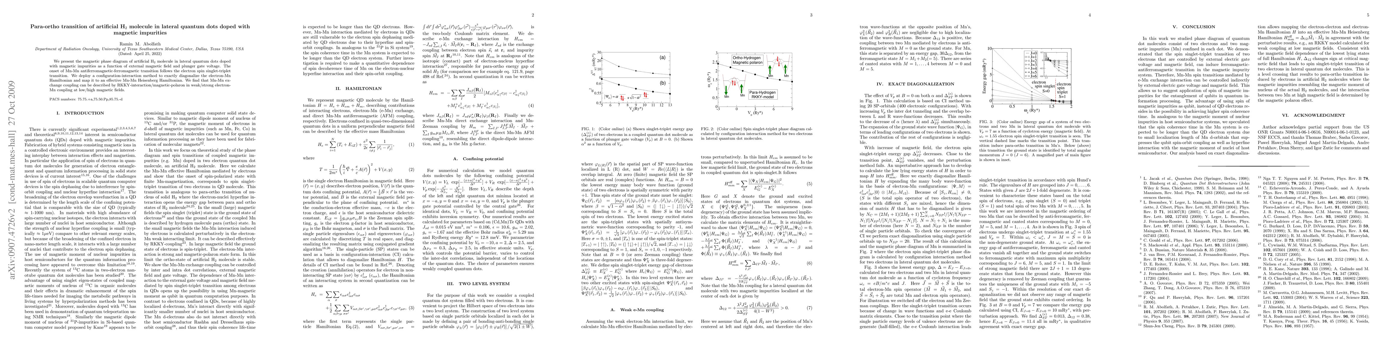 We present the magnetic phase diagram of artificial H$_2$ molecule in lateral quantum dots doped with magnetic impurities as a function of external magnetic field and plunger gate voltage. The onset of Mn-Mn antiferromagnetic-ferromagnetic transition follows the electron spin singlet-triplet transition. We deploy a configuration-interaction method to exactly diagonalize the electron-Mn Hamiltonian and map it to an effective Mn-Mn Heisenberg Hamiltonian. We find that Mn-Mn exchange coupling can be described by RKKY-interaction/magnetic-polaron in weak/strong electron-Mn coupling at low/high magnetic fields.