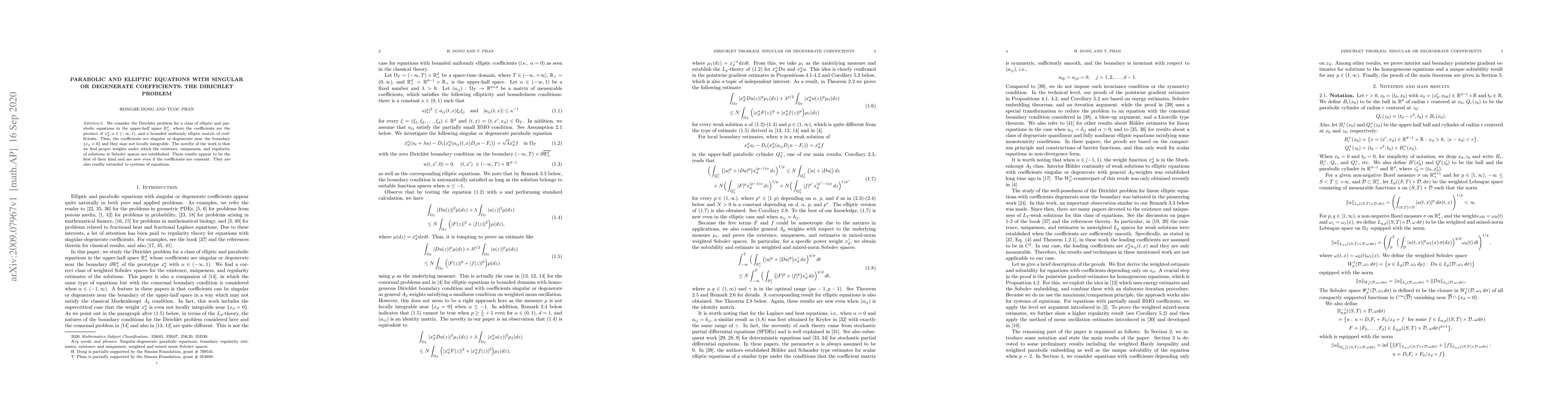 This paper addresses the Dirichlet problem for elliptic and parabolic equations with singular or degenerate coefficients in the upper-half space, establishing the existence, uniqueness, and regularity of solutions in Sobolev spaces using appropriate weights. The findings are novel even for constant coefficients and extend to systems of equations.