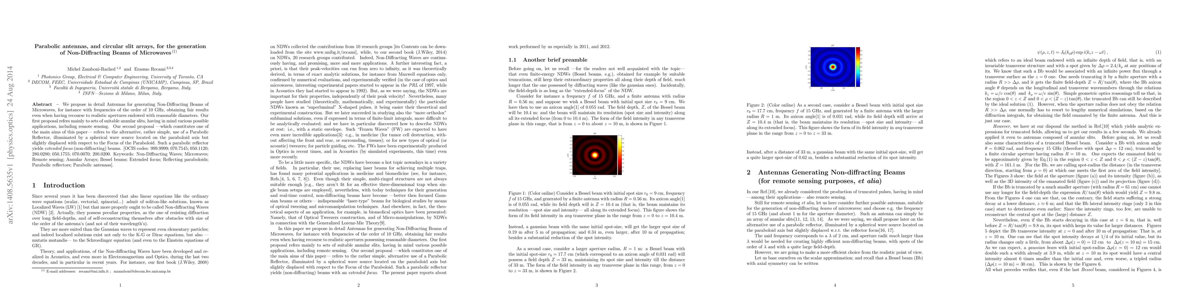 This paper proposes antennas for generating non-diffracting microwave beams at frequencies around 10 GHz, including parabolic reflectors and circular slot arrays. The study focuses on achieving extended focus beams with minimal diffraction, highlighting potential applications in remote sensing.