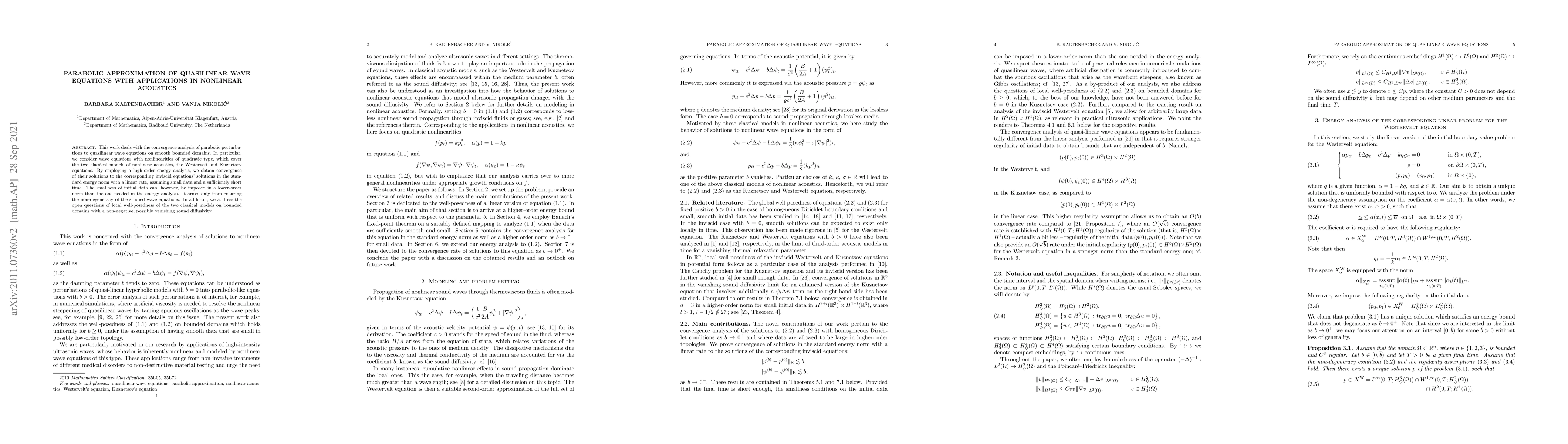 This work deals with the convergence analysis of parabolic perturbations to quasilinear wave equations on smooth bounded domains. In particular, we consider wave equations with nonlinearities of quadratic type, which cover the two classical models of nonlinear acoustics, the Westervelt and Kuznetsov equations. By employing a high-order energy analysis, we obtain convergence of their solutions to the corresponding inviscid equations' solutions in the standard energy norm with a linear rate, assuming small data and a sufficiently short time. The smallness of initial data can, however, be imposed in a lower-order norm than the one needed in the energy analysis. It arises only from ensuring the non-degeneracy of the studied wave equations. In addition, we address the open questions of local well-posedness of the two classical models on bounded domains with a non-negative, possibly vanishing sound diffusivity.