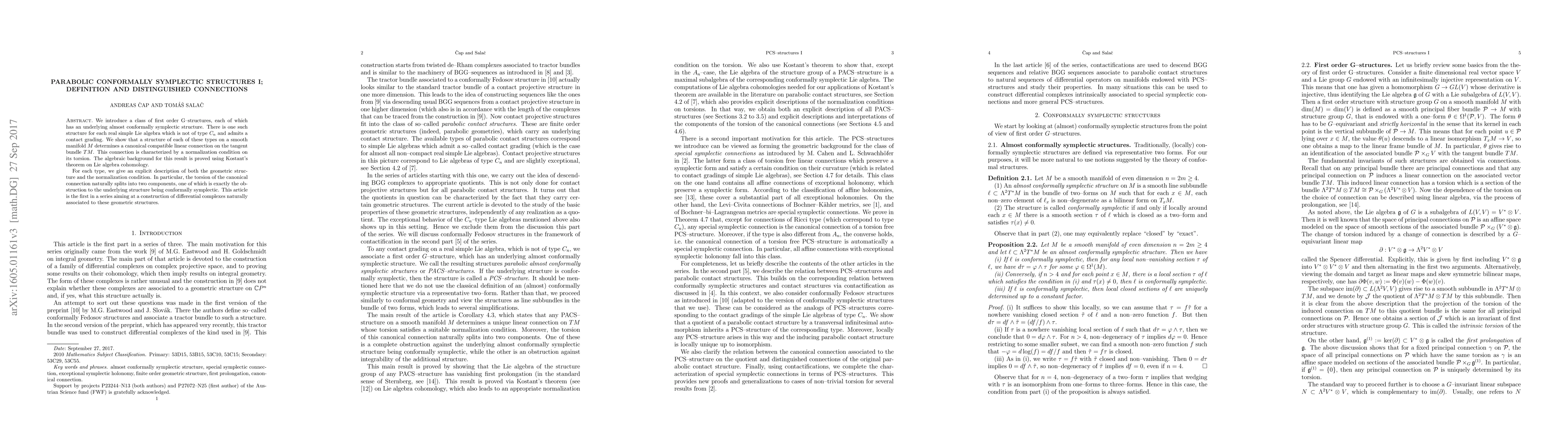 Summary: This paper introduces a novel class of first-order G-structures based on almost conformally symplectic structures, linked to specific real simple Lie algebras. It demonstrates that these structures on a manifold determine a unique, canonical linear connection characterized by a specific torsion normalization condition. The findings pave the way for future constructions of differential complexes associated with these structures.