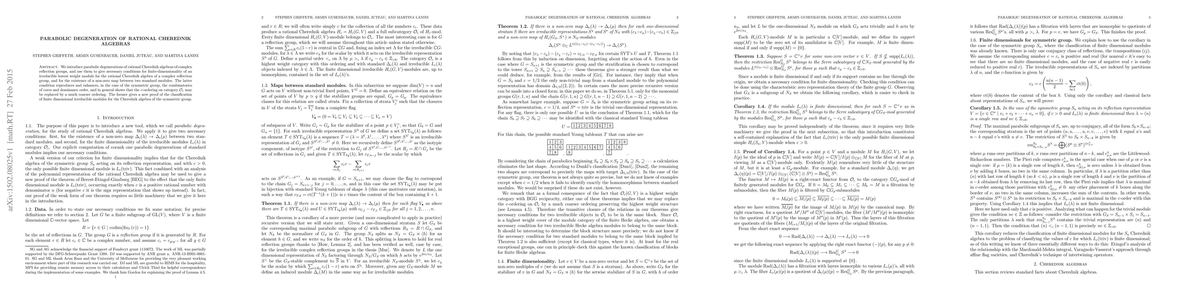 This paper introduces parabolic degenerations of rational Cherednik algebras for complex reflection groups, providing necessary conditions for the finite-dimensionality of irreducible lowest weight modules and the existence of non-zero maps between standard modules. It also offers a new proof of the classification of finite-dimensional irreducible modules for the symmetric group's Cherednik algebra.