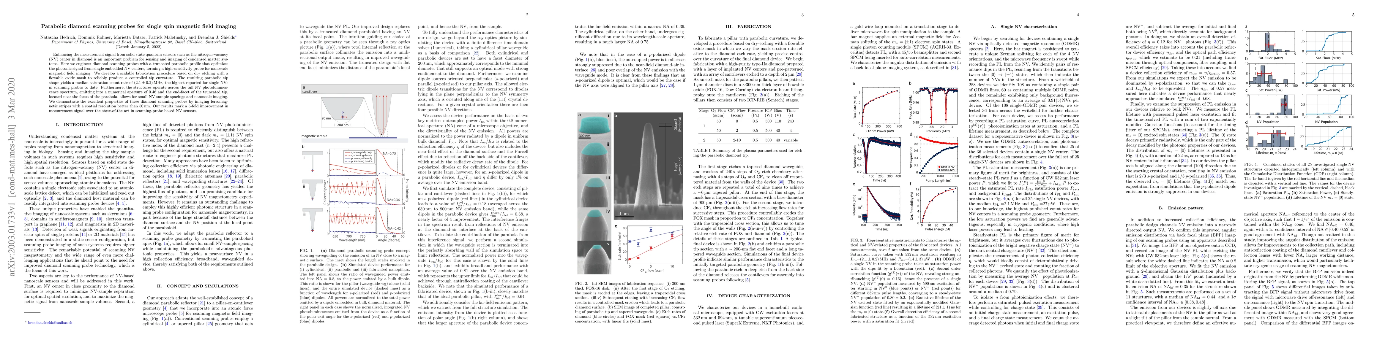 This paper presents engineered diamond scanning probes with a parabolic shape to enhance the photonic signal from single NV centers, achieving a 5-fold improvement in signal over the state-of-the-art, and demonstrating nanoscale magnetic field imaging resolution better than 50 nm.