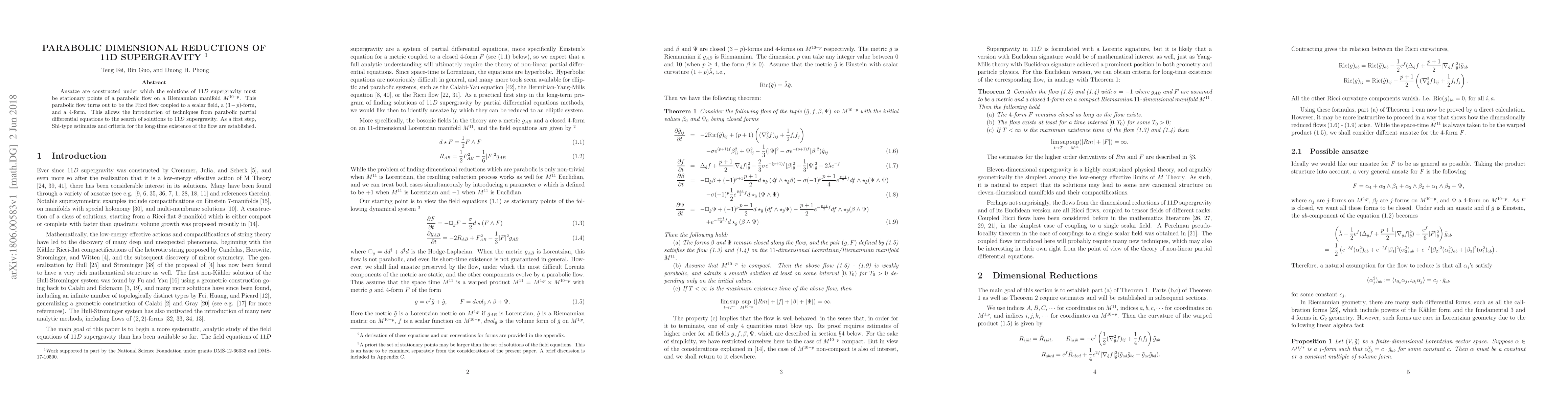 This paper constructs ansätze showing that 11D supergravity solutions are stationary points of a parabolic flow on a reduced-dimensional Riemannian manifold. The flow combines Ricci flow with scalar fields and forms, enabling the application of parabolic PDE techniques to search for supergravity solutions, with initial focus on establishing Shi-type estimates and criteria for the flow's long-time existence.