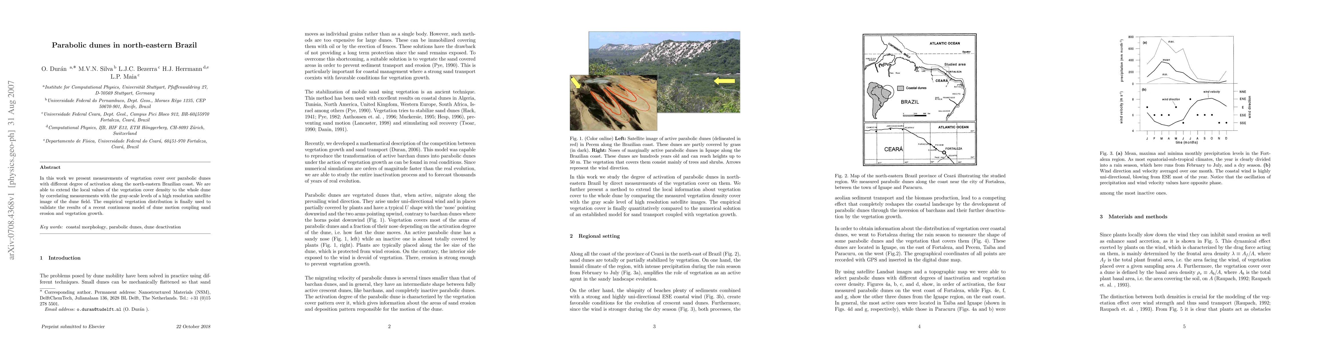 In this work we present measurements of vegetation cover over parabolic dunes with different degree of activation along the north-eastern Brazilian coast. We are able to extend the local values of the vegetation cover density to the whole dune by correlating measurements with the gray-scale levels of a high resolution satellite image of the dune field. The empirical vegetation distribution is finally used to validate the results of a recent continuous model of dune motion coupling sand erosion and vegetation growth.