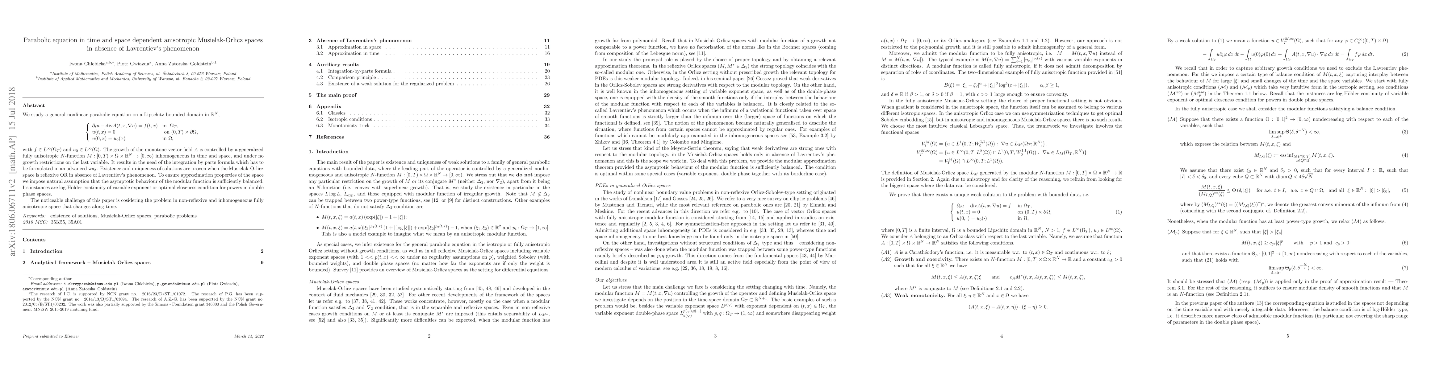 We study a general nonlinear parabolic equation on a Lipschitz bounded domain in $\mathbb{R}^N$, \begin{equation*} \left\{\begin{array}{l l} \partial_t u-\mathrm{div} A(t,x,\nabla u)= f(t,x)&\text{in}\ \ \Omega_T,\\ u(t,x)=0 &\ \mathrm{ on} \ (0,T)\times\partial\Omega,\\ u(0,x)=u_0(x)&\text{in}\ \Omega, \end{array}\right. \end{equation*} with $f\in L^\infty(\Omega_T)$ and $u_0\in L^\infty(\Omega)$. The growth of the monotone vector field $A$ is controlled by a generalized fully anisotropic $N$-function $M:[0,T)\times\Omega\times\mathbb{R}^N\to[0,\infty)$ inhomogeneous in time and space, and under no growth restrictions on the last variable. It results in the need of the integration by parts formula which has to be formulated in an advanced way. Existence and uniqueness of solutions are proven when the Musielak-Orlicz space is reflexive OR in absence of Lavrentiev's phenomenon. To ensure approximation properties of the space we impose natural assumption that the asymptotic behaviour of the modular function is sufficiently balanced. Its instances are log-H\"older continuity of variable exponent or optimal closeness condition for powers in double phase spaces. The noticeable challenge of this paper is cosidering the problem in non-reflexive and inhomogeneous fully anisotropic space that changes along time.