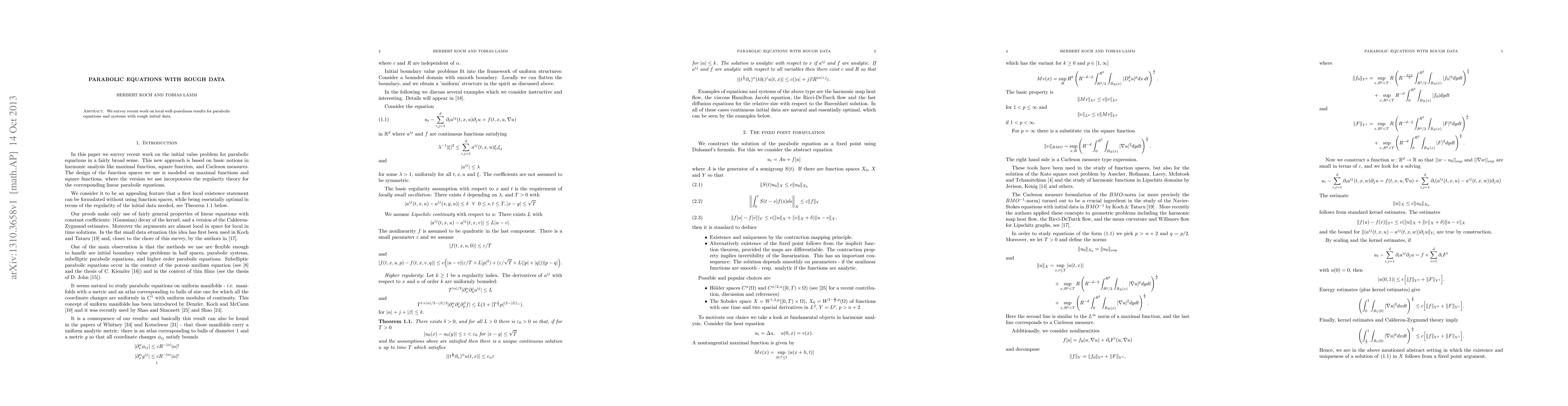 We survey recent work on local well-posedness results for parabolic equations and systems with rough initial data.