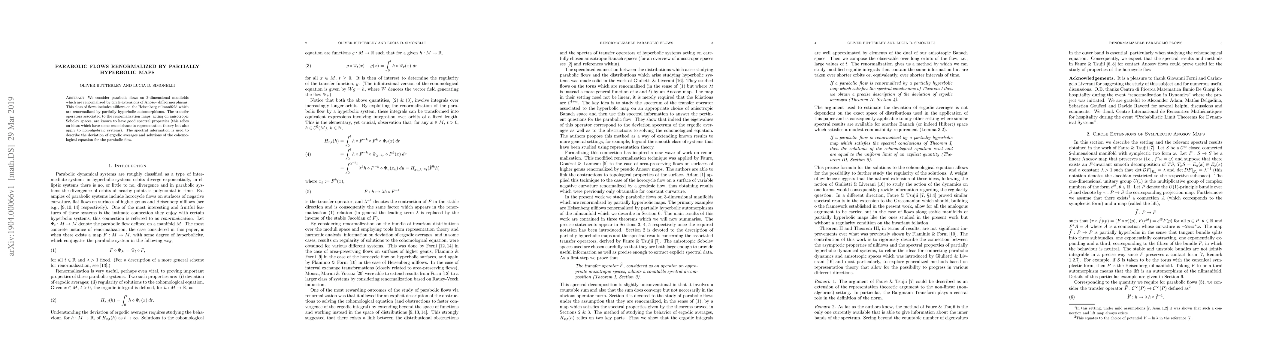 We consider parabolic flows on 3-dimensional manifolds which are renormalized by circle extensions of Anosov diffeormorphisms. This class of flows includes nilflows on the Heisenberg nilmanifold which are renormalized by partially hyperbolic automorphisms. The transfer operators associated to the renormalization maps, acting on anisotropic Sobolev spaces, are known to have good spectral properties (this relies on ideas which have some resemblance to representation theory but also apply to non-algebraic systems). The spectral information is used to describe the deviation of ergodic averages and solutions of the cohomological equation for the parabolic flow.