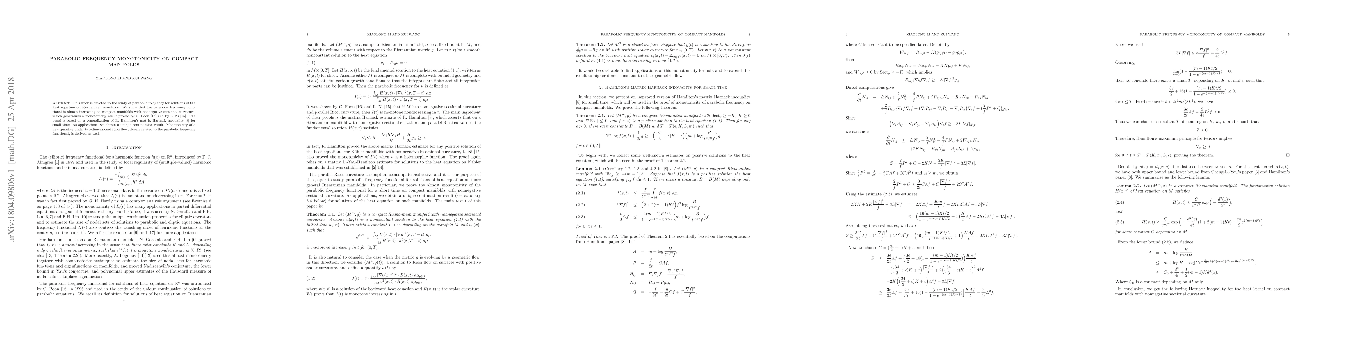 This work is devoted to the study of parabolic frequency for solutions of the heat equation on Riemannian manifolds. We show that the parabolic frequency functional is almost increasing on compact manifolds with nonnegative sectional curvature, which generalizes a monotonicity result proved by C. Poon and by L. Ni. The proof is based on a generalization of R. Hamilton's matrix Harnack inequality for small time. As applications, we obtain a unique continuation result. Monotonicity of a new quantity under two-dimensional Ricci flow, closely related to the parabolic frequency functional, is derived as well.