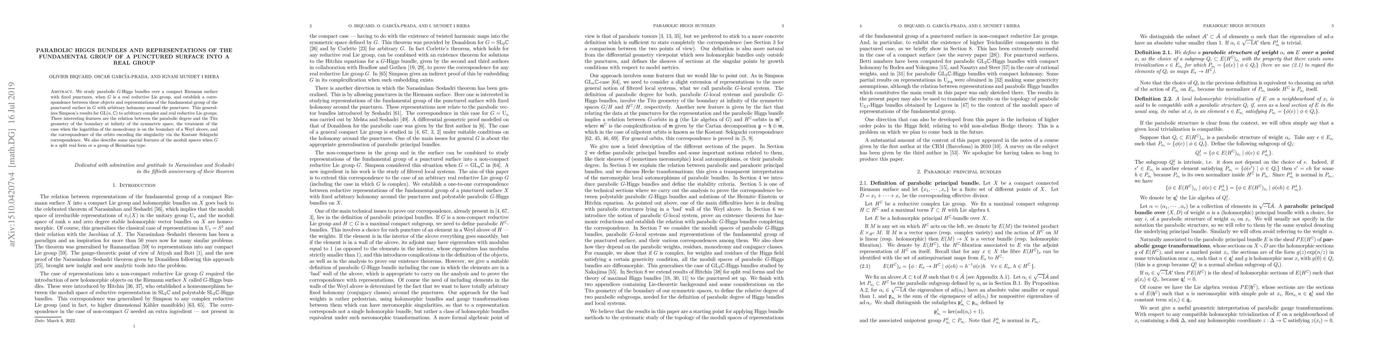 This paper investigates parabolic G-Higgs bundles over a compact Riemann surface with punctures, establishing a link between these bundles and representations of the punctured surface's fundamental group. It highlights the role of parabolic degree, handling monodromy near punctures, and discusses the Kostant-Sekiguchi correspondence for singularities.