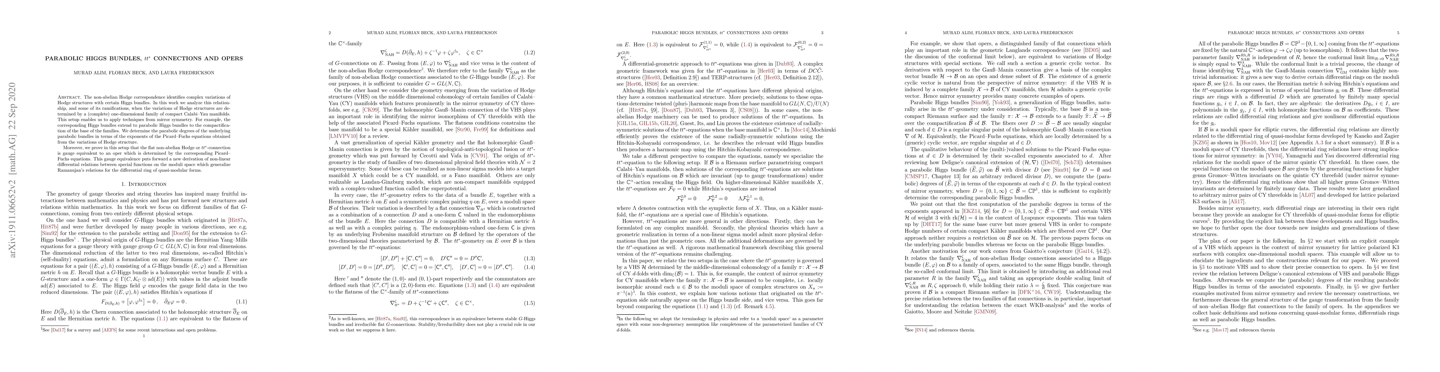 This paper explores the connection between complex variations of Hodge structures and parabolic Higgs bundles, leveraging techniques from mirror symmetry. It determines the parabolic degrees in terms of Picard-Fuchs exponents and shows the gauge equivalence between the $tt^*$-connection and an oper, leading to new non-linear differential relations for special functions on the moduli space.