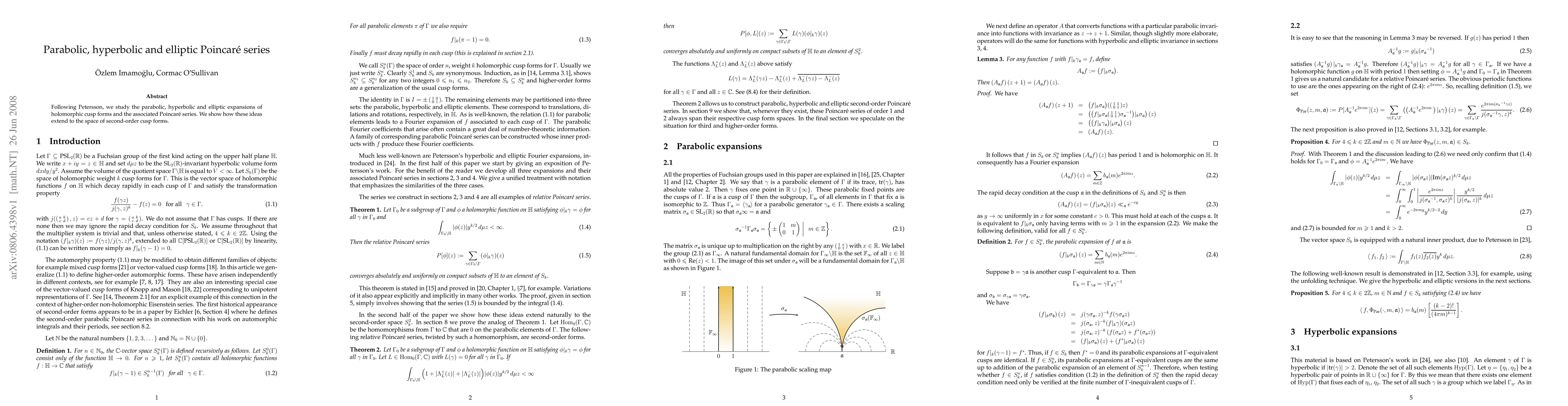 Following Petersson, we study the parabolic, hyperbolic and elliptic expansions of holomorphic cusp forms and the associated Poincar\'e series. We show how these ideas extend to the space of second-order cusp forms.