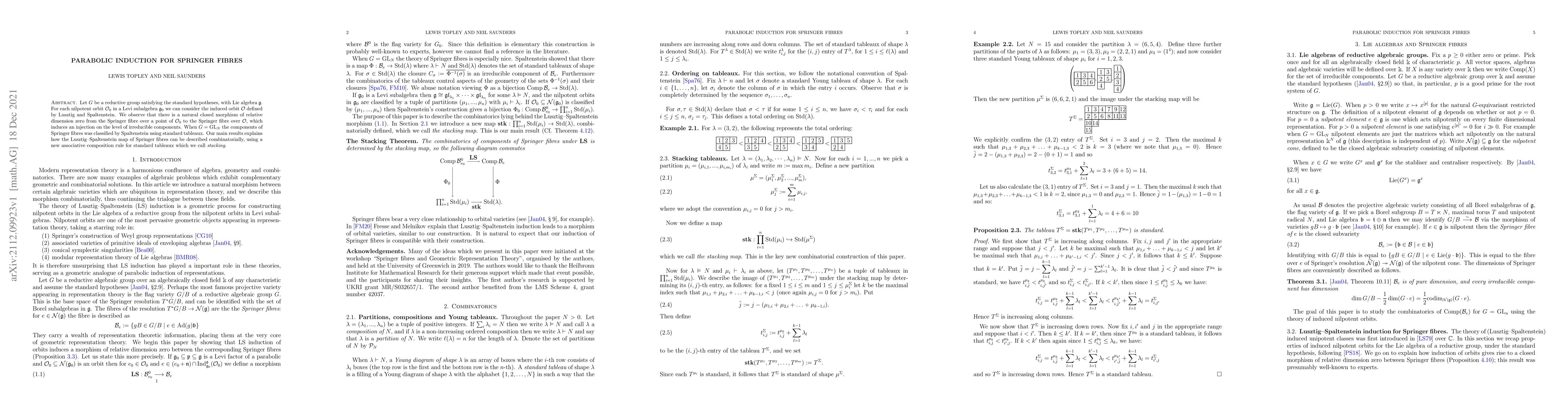Let $G$ be a reductive group satisfying the standard hypotheses, with Lie algebra $\mathfrak{g}$. For each nilpotent orbit $\mathcal{O}_0$ in a Levi subalgebra $\mathfrak{g}_0$ we can consider the induced orbit $\mathcal{O}$ defined by Lusztig and Spaltenstein. We observe that there is a natural closed morphism of relative dimension zero from the Springer fibre over a point of $\mathcal{O}_0$ to the Springer fibre over $\mathcal{O}$, which induces an injection on the level of irreducible components. When $G = \operatorname{GL}_N$ the components of Springer fibres was classified by Spaltenstein using standard tableaux. Our main results explains how the Lusztig--Spaltenstein map of Springer fibres can be described combinatorially, using a new associative composition rule for standard tableaux which we call stacking.