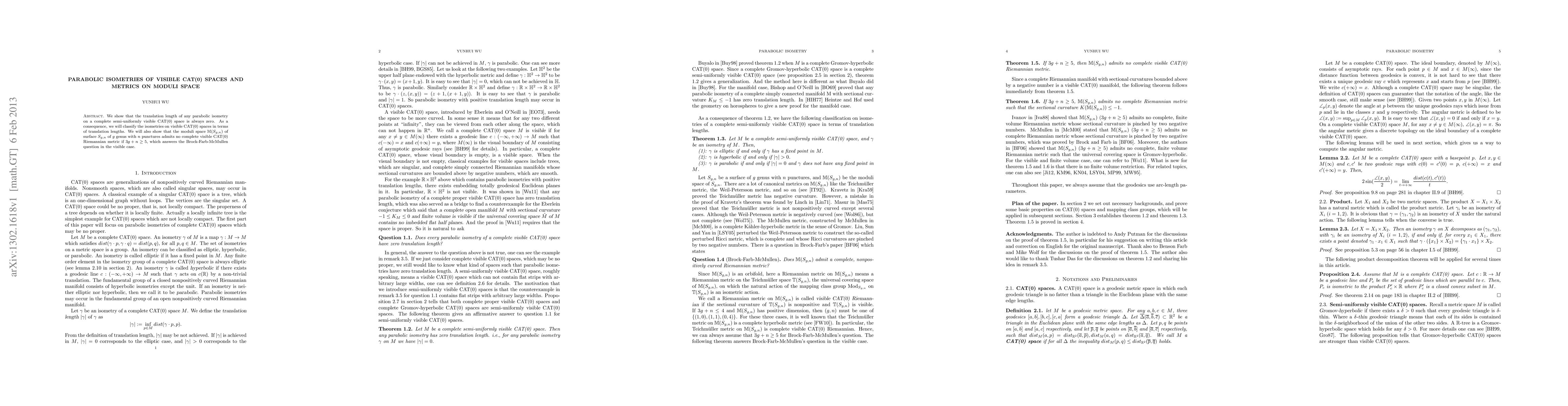 Summary: This paper demonstrates that parabolic isometries in complete semi-uniformly visible CAT(0) spaces have zero translation length and classifies these isometries based on translation lengths. Additionally, it proves that the moduli space of surfaces with certain genus and punctures cannot support a complete visible CAT(0) Riemannian metric if the total count of genus and punctures is five or more.