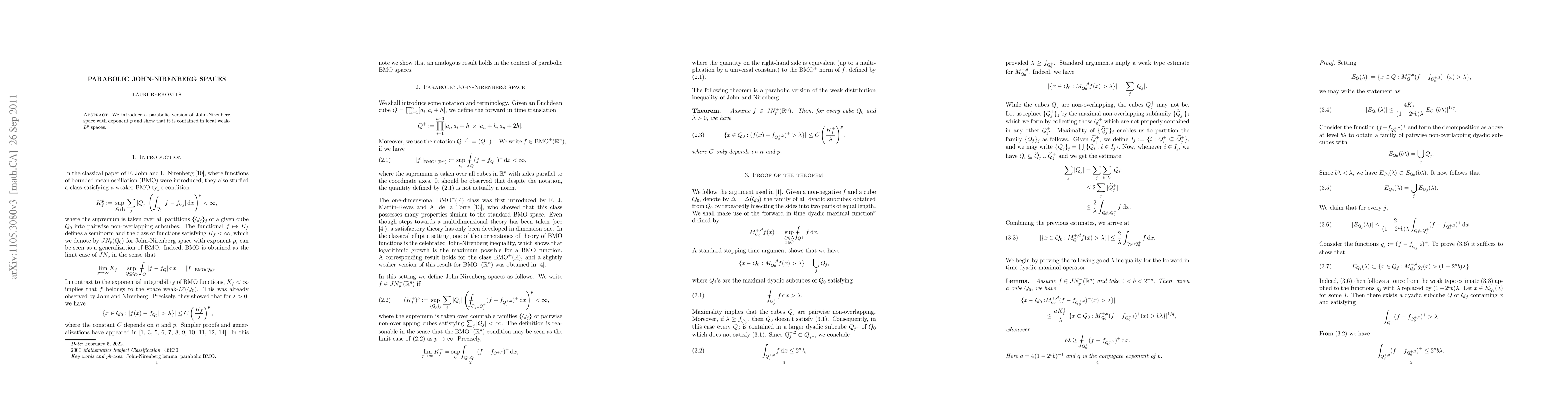 Summary: This paper introduces a parabolic version of the John-Nirenberg space, demonstrating its containment within local weak-$L^p$ spaces, thus extending classical results to the parabolic setting.