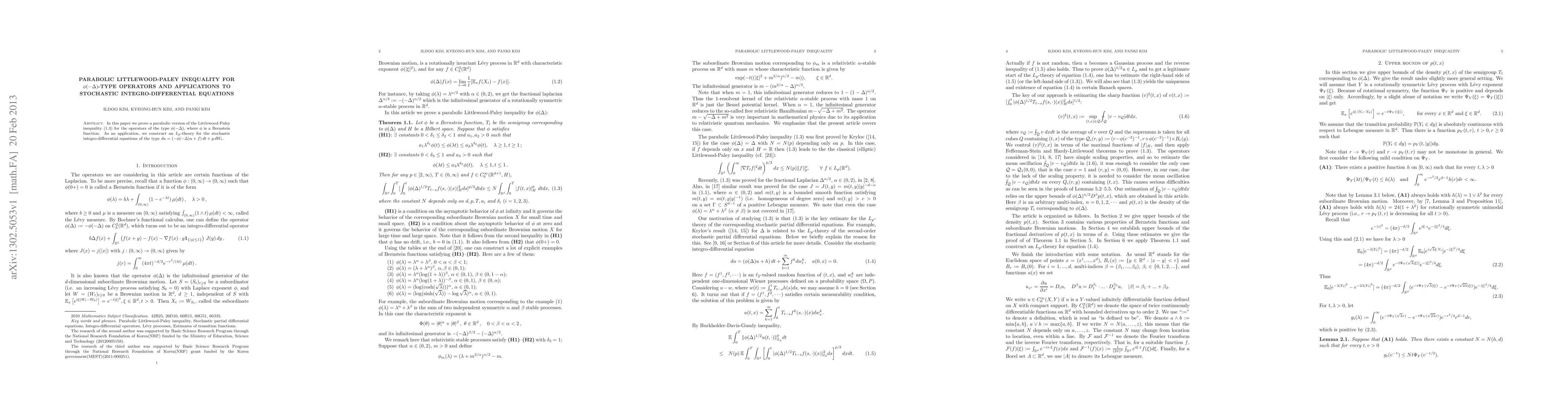 This paper proves a parabolic Littlewood-Paley inequality for $\phi(-\Delta)$-type operators, utilizing Bernstein functions. It applies this result to develop an $L_p$-theory for stochastic integro-differential equations of the form $du=(-\phi(-\Delta)u+f)dt +gdW_t$.