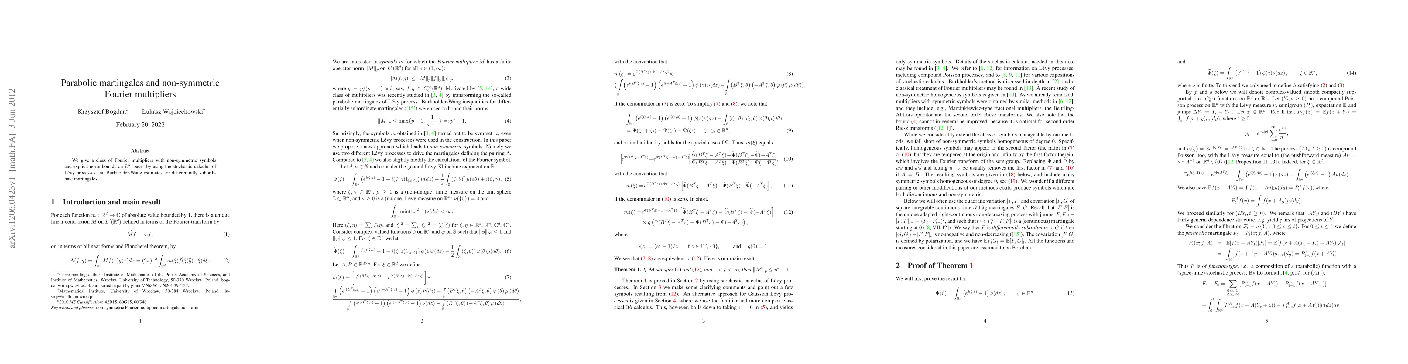 Summary: This paper introduces a class of non-symmetric Fourier multipliers with explicit norm bounds on $L^p$ spaces, utilizing stochastic calculus of L\'evy processes and Burkholder-Wang estimates for parabolic martingales.