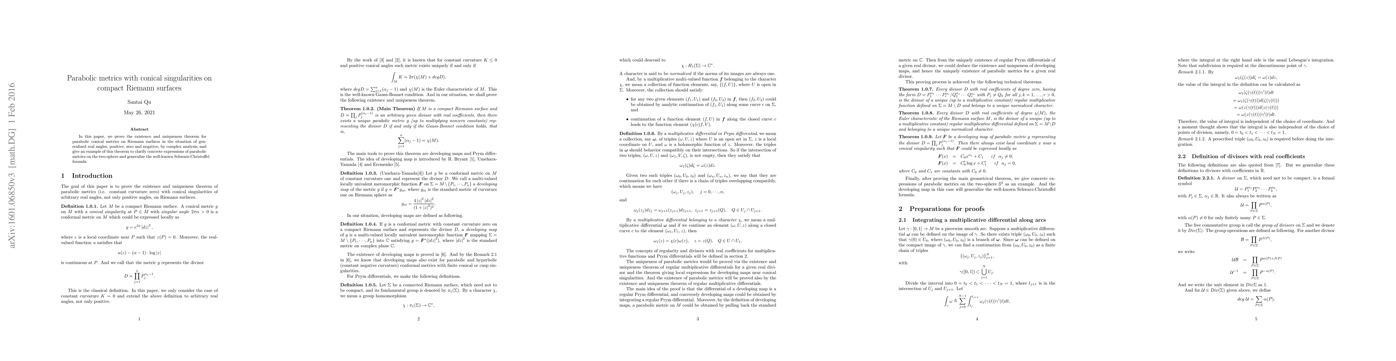 This paper establishes the existence and uniqueness of parabolic conical metrics on compact Riemann surfaces, employing complex analysis for generalized real angles. It also provides an example to illustrate the application of these metrics on the two-sphere and extends the Schwarz-Christoffel formula.