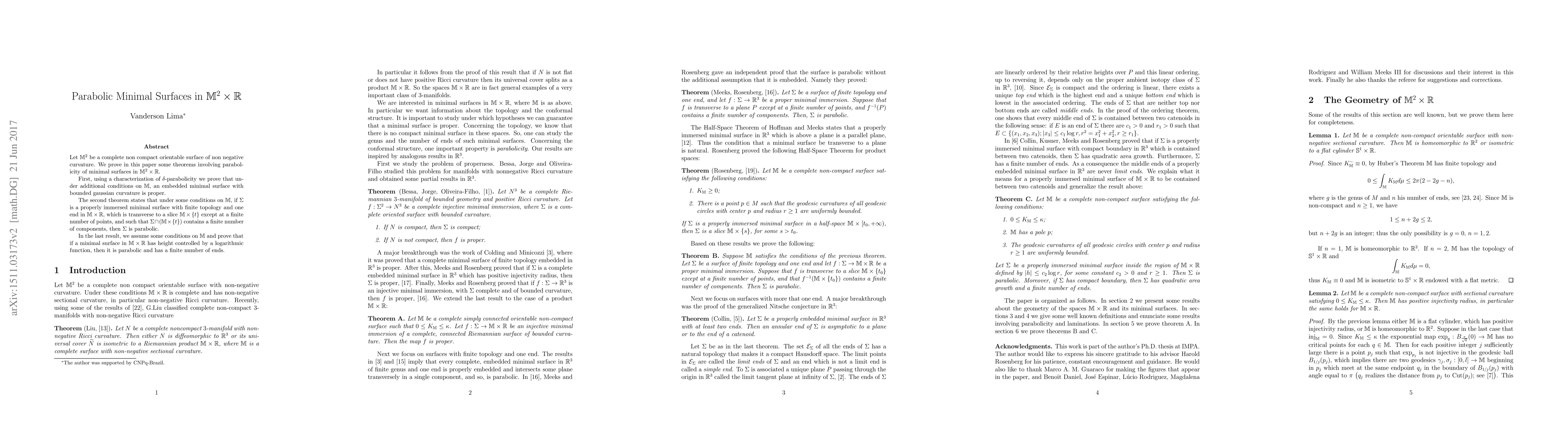 Let $\mathbb{M}^{2}$ be a complete non compact orientable surface of non negative curvature. We prove in this paper some theorems involving parabolicity of minimal surfaces in $\mathbb{M}^{2}\times\mathbb{R}$. First, using a characterization of $\delta$-parabolicity we prove that under additional conditions on $\mathbb{M}$, an embedded minimal surface with bounded gaussian curvature is proper. The second theorem states that under some conditions on $\mathbb{M}$, if $\Sigma$ is a properly immersed minimal surface with finite topology and one end in $\mathbb{M}\times\mathbb{R}$, which is transverse to a slice $\mathbb{M}\times\{t\}$ except at a finite number of points, and such that $\Sigma\cap(\mathbb{M}\times\{t\})$ contains a finite number of components, then $\Sigma$ is parabolic. In the last result, we assume some conditions on $\mathbb{M}$ and prove that if a minimal surface in $\mathbb{M}\times\mathbb{R}$ has height controlled by a logarithmic function, then it is parabolic and has a finite number of ends.
