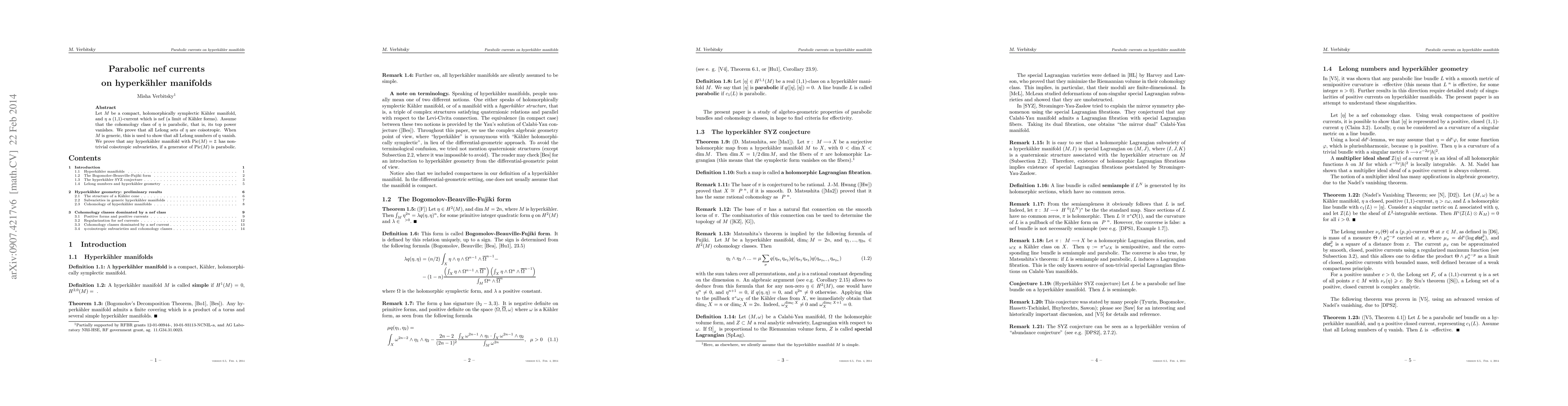 This research proves that for compact, holomorphically symplectic Kahler manifolds with parabolic nef (1,1)-currents, Lelong sets are coisotropic. When the manifold is generic, all Lelong numbers vanish. Additionally, it's shown that hyperkaehler manifolds with rank 1 Picard group and parabolic generator have non-trivial coisotropic subvarieties.