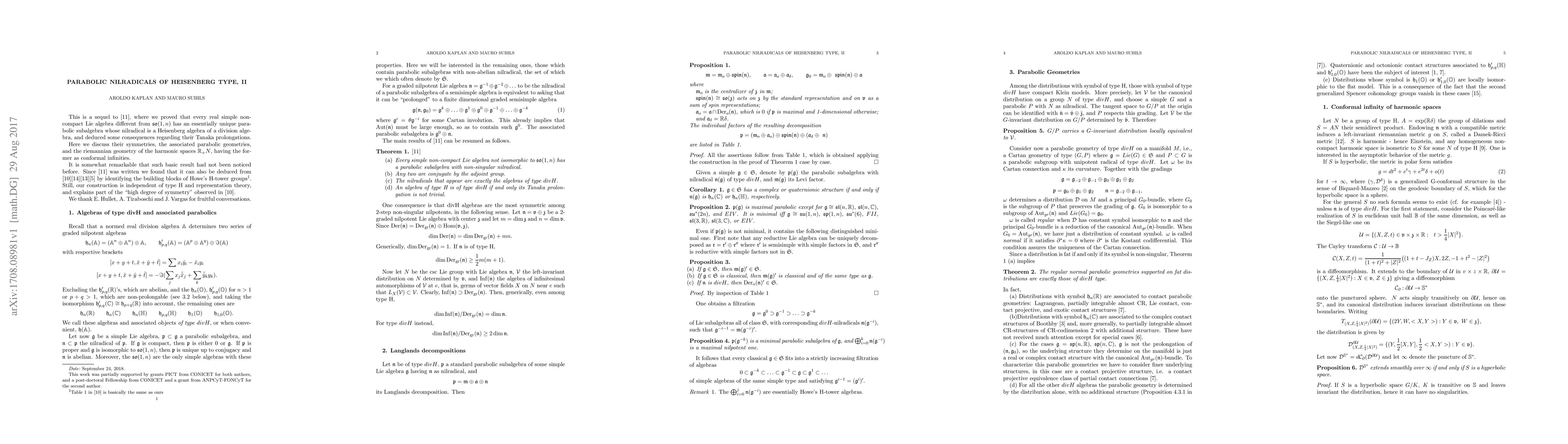 Every real simple non-compact Lie algebra not isomorphic to $\mathfrak{so}(1,n)$ contains a unique standard parabolic subalgebra whose nilradical is a generalized Heisenberg algebra. Here we discuss the associated parabolic geometries and the riemannian geometry of the harmonic spaces having the former as conformal infinities.