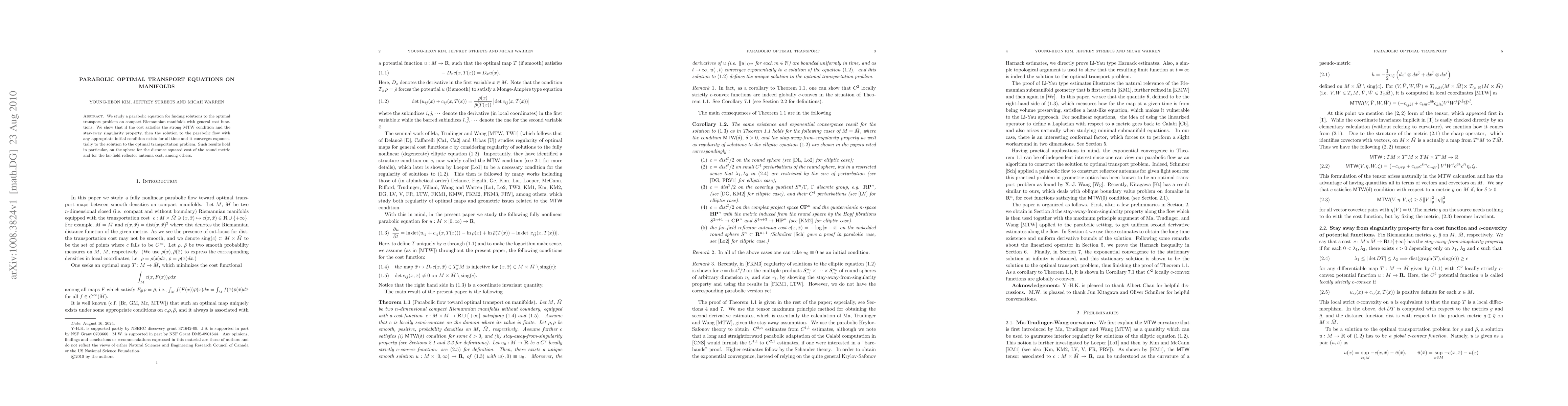 We study a parabolic equation for finding solutions to the optimal transport problem on compact Riemannian manifolds with general cost functions. We show that if the cost satisfies the strong MTW condition and the stay-away singularity property, then the solution to the parabolic flow with any appropriate initial condition exists for all time and it converges exponentially to the solution to the optimal transportation problem. Such results hold in particular, on the sphere for the distance squared cost of the round metric and for the far-field reflector antenna cost, among others.
