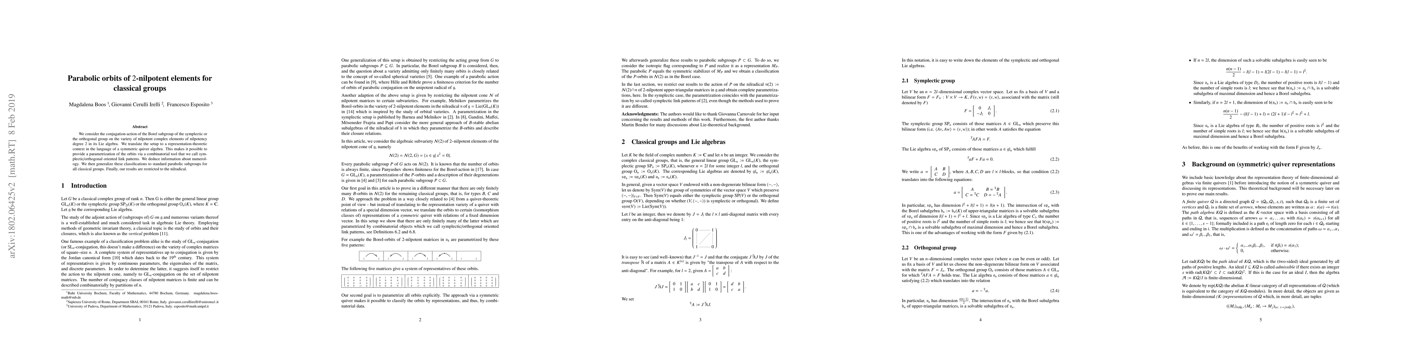 We consider the conjugation-action of the Borel subgroup of the symplectic or the orthogonal group on the variety of nilpotent complex elements of nilpotency degree $2$ in its Lie algebra. We translate the setup to a representation-theoretic context in the language of a symmetric quiver algebra. This makes it possible to provide a parametrization of the orbits via a combinatorial tool that we call symplectic/orthogonal oriented link patterns. We deduce information about numerology. We then generalize these classifications to standard parabolic subgroups for all classical groups. Finally, our results are restricted to the nilradical.