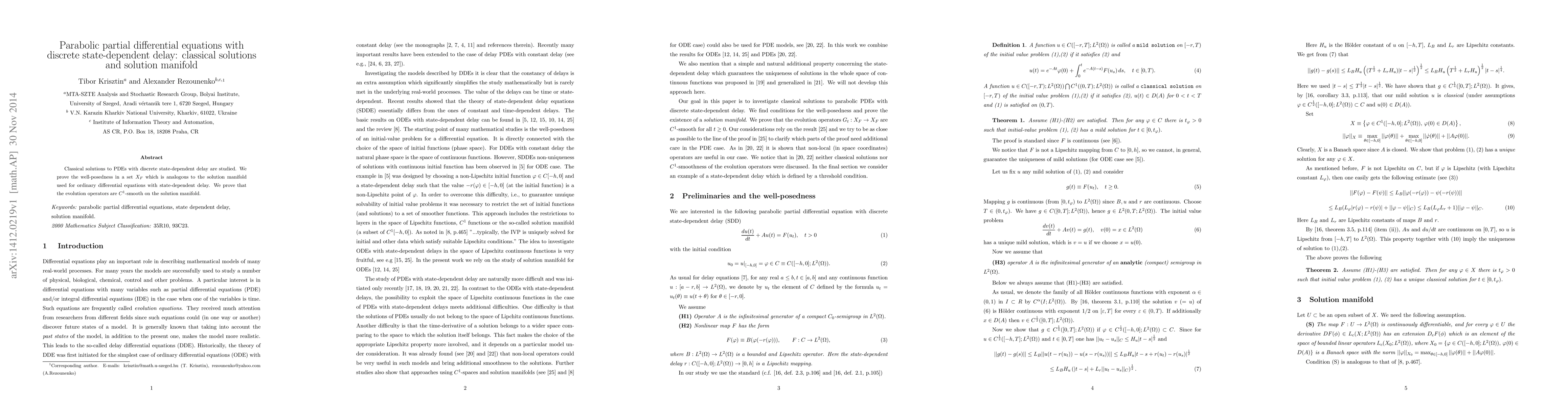 This paper investigates classical solutions for parabolic partial differential equations with discrete state-dependent delays. The authors establish well-posedness in a space analogous to the solution manifold for ordinary differential equations with similar delays and demonstrate $C^1$-smoothness of the evolution operators on this manifold.