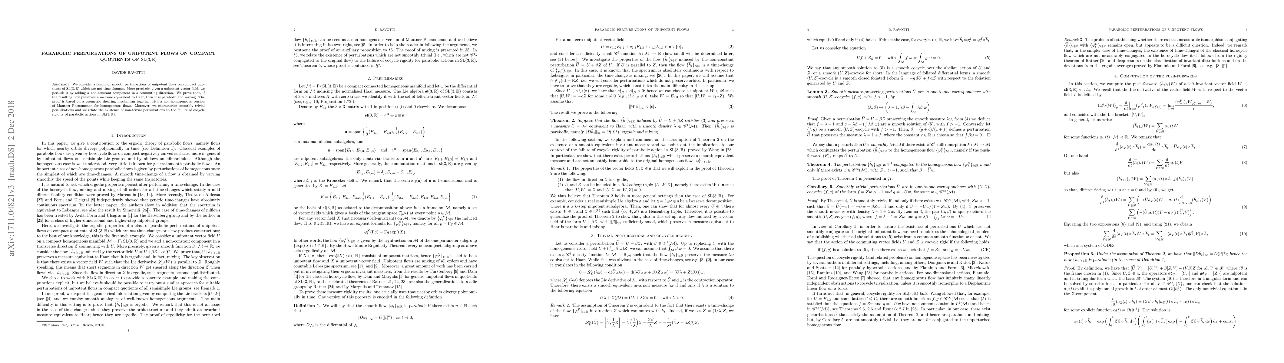 This paper studies smooth perturbations of unipotent flows on compact quotients of $\text{SL}(3,\mathbb{R})$, proving that perturbed flows preserving a Haar-equivalent measure are parabolic and mixing. The proof leverages geometric shearing and a non-homogeneous Mautner Phenomenon.
