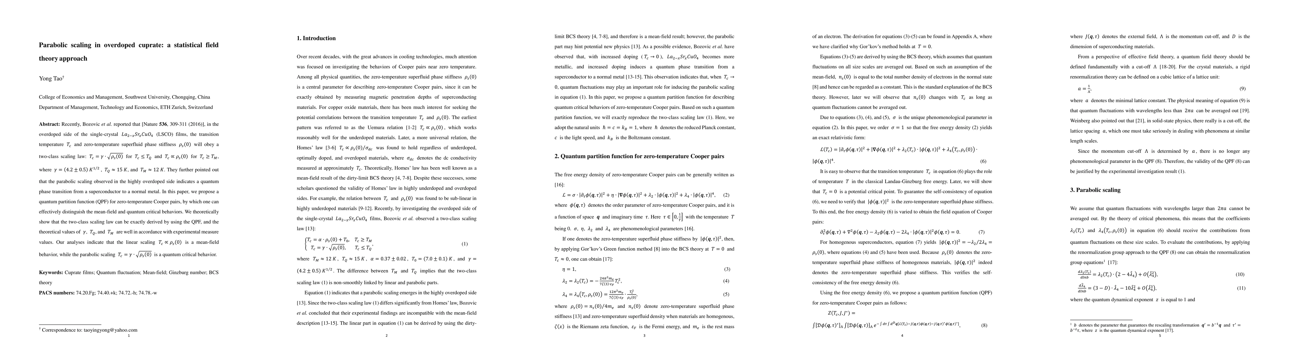 Recently, Bozovic et al. reported that [Nature 536, 309-311 (2016)], in the overdoped side of the single-crystal $La_{2-x}Sr_xCuO_4$ (LSCO) films, the transition temperature $T_c$ and zero-temperature superfluid phase stiffness $\rho_s(0)$ will obey a two-class scaling law: $T_c=\gamma \cdot \sqrt{\rho_s(0)}$ for $T_c \leq T_Q$ and $T_c \propto \rho_s(0)$ for $T_c \geq T_M$, where $\gamma=(4.2 \pm 0.5) K^{1/2} $, $T_Q \approx 15 K$, and $T_M \approx 12 K$. They further pointed out that the parabolic scaling observed in the highly overdoped side indicates a quantum phase transition from a superconductor to a normal metal. In this paper, we propose a quantum partition function (QPF) for zero-temperature Cooper pairs, by which one can effectively distinguish between mean-field and quantum critical behaviors. We theoretically show that the two-class scaling law can be exactly derived by using the QPF, and the theoretical values of $\gamma$, $T_Q$, and $T_M$ are well in accordance with experimental measure values. Our analyses indicate that the linear scaling $T_c \propto \rho_s(0)$ is a mean-field behavior, while the parabolic scaling $T_c=\gamma \cdot \sqrt{\rho_s(0)}$ is a quantum critical behavior.