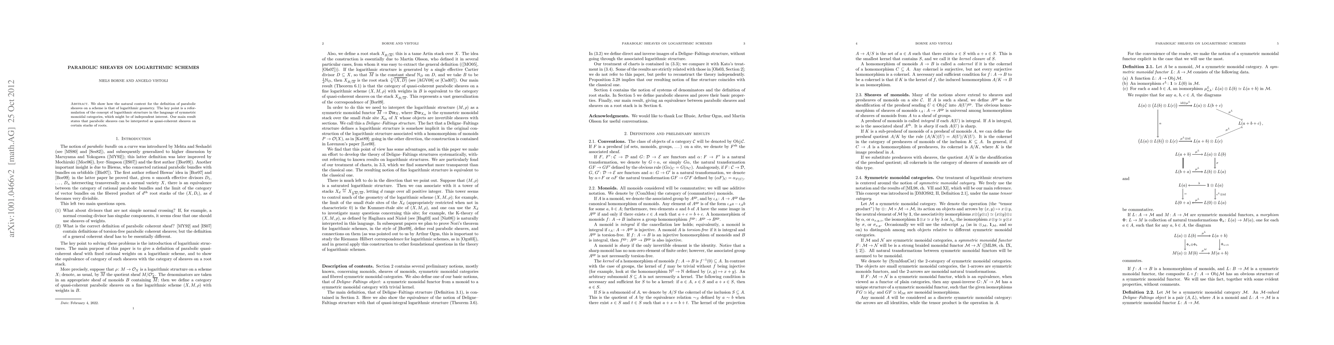 This paper explores the definition of parabolic sheaves within the framework of logarithmic geometry, reformulating logarithmic structures using symmetric monoidal categories. The main result establishes that parabolic sheaves correspond to quasi-coherent sheaves on specific stacks of roots.