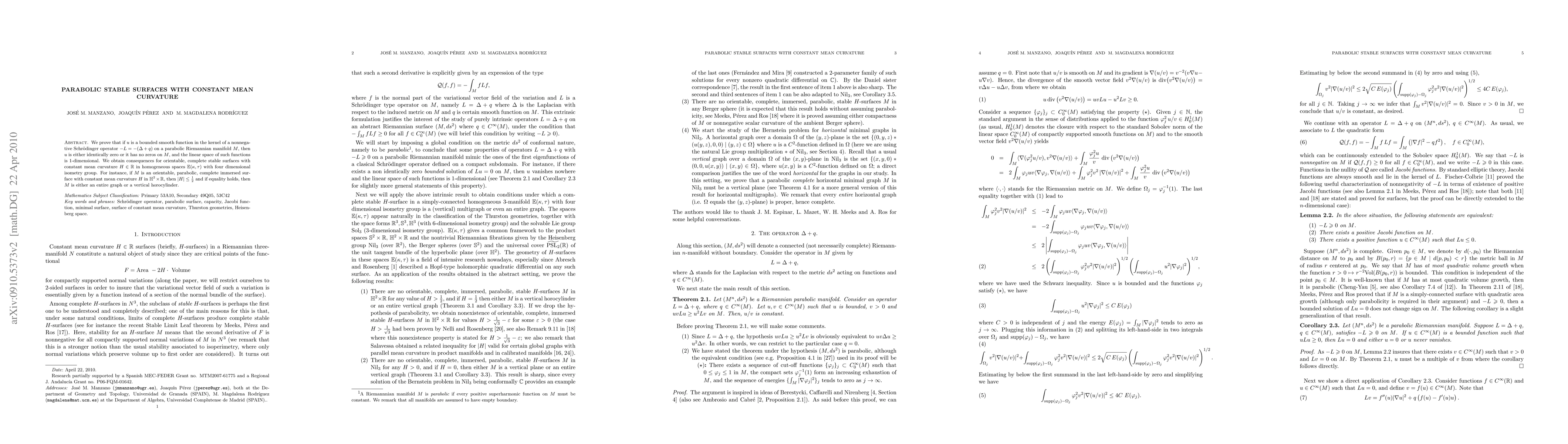 This paper proves that bounded smooth functions in the kernel of a nonnegative Schrödinger operator on a parabolic Riemannian manifold are either zero or non-vanishing, leading to a 1-dimensional linear space of such functions. It also deduces constraints on the constant mean curvature of orientable, complete stable surfaces in homogeneous spaces, specifically showing that if such a surface lies in $\mathbb{H}^2\times\mathbb{R}$, its absolute mean curvature cannot exceed 1/2.