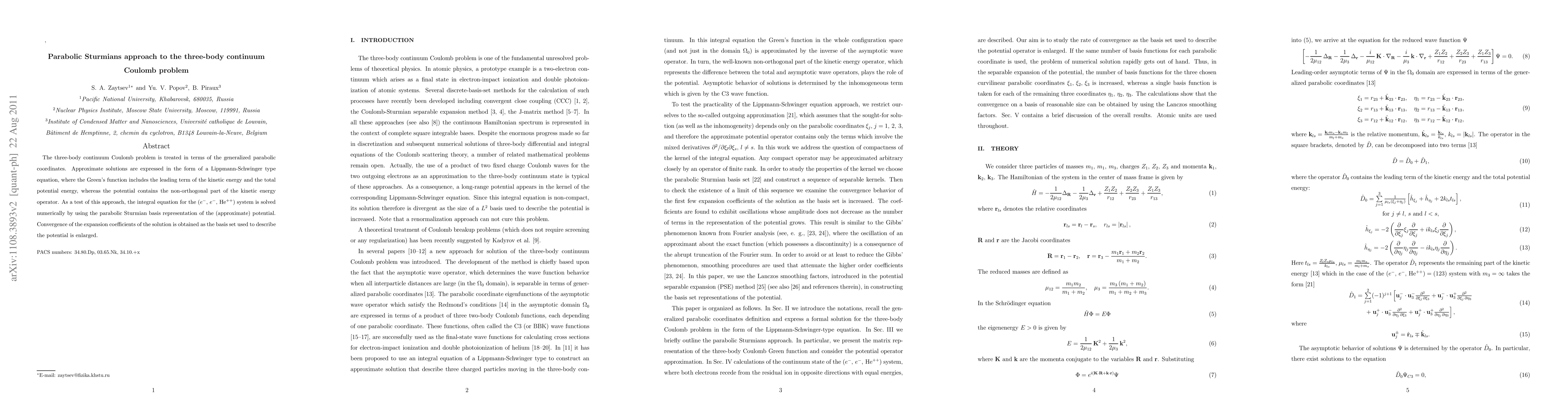 The three-body continuum Coulomb problem is treated in terms of the generalized parabolic coordinates. Approximate solutions are expressed in the form of a Lippmann-Schwinger type equation, where the Green's function includes the leading term of the kinetic energy and the total potential energy, whereas the potential contains the non-orthogonal part of the kinetic energy operator. As a test of this approach, the integral equation for the $(e^-,\, e^-,\, {{He}^{++}})$ system is solved numerically by using the parabolic Sturmian basis representation of the (approximate) potential. Convergence of the expansion coefficients of the solution is obtained as the basis set used to describe the potential is enlarged.