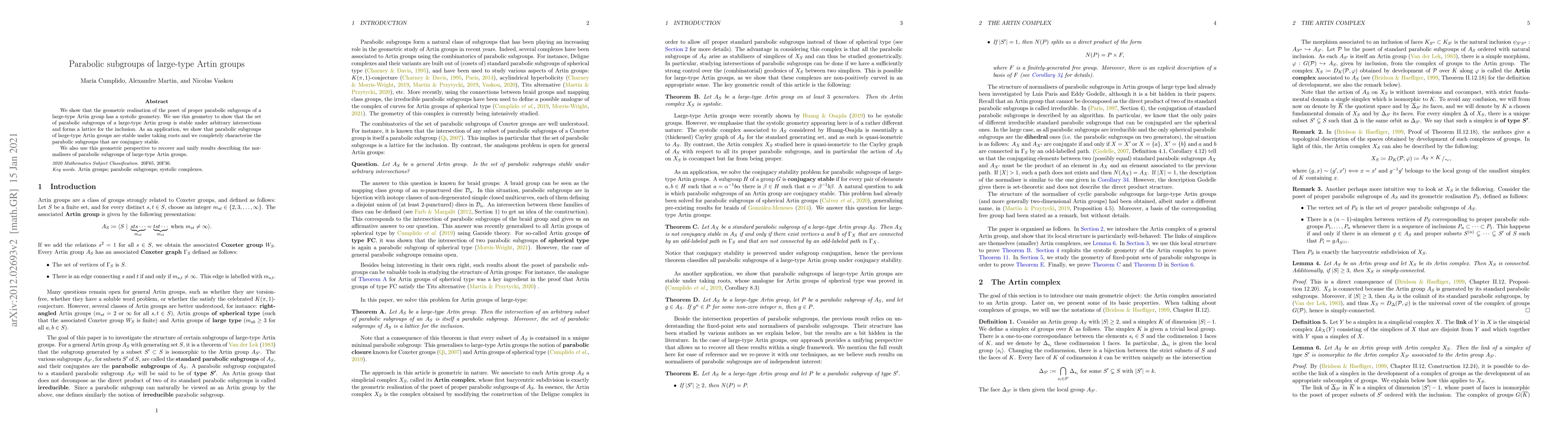This paper demonstrates that the geometric structure of proper parabolic subgroups in large-type Artin groups exhibits systolic geometry, which ensures stability under intersections and forms a lattice. It also characterizes conjugacy stability and roots of these subgroups, and unifies results on their normalisers.