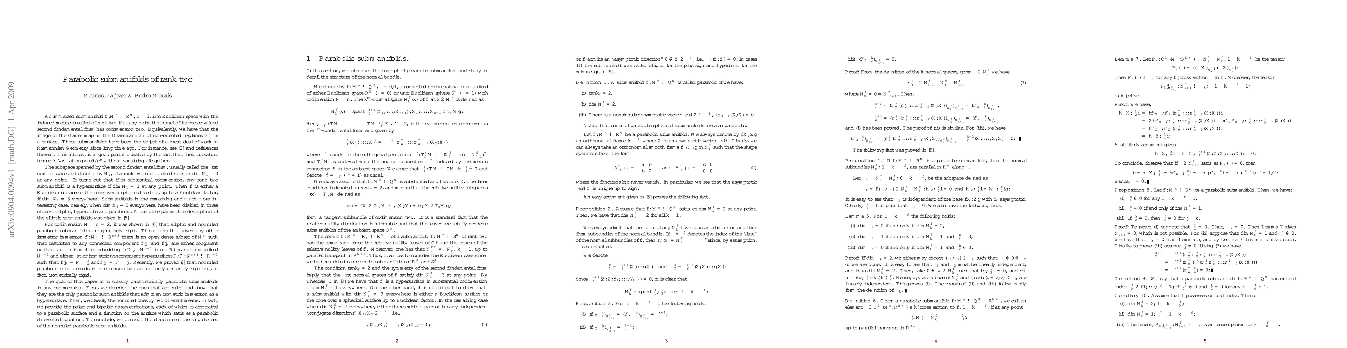 The goal of this paper is to classify parametrically parabolic submanifolds in any codimension. First, we describe the ones that are ruled and show that they are the only parabolic submanifolds that admit an isometric immersion as a hypersurface. Then, we classify the nonruled ones by two different means. In fact, we provide the polar and bipolar parametrizations, each of which is associated to a parabolic surface and a function on the surface which satisfies a parabolic differential equation. To conclude, we describe the structure of the singular set of the nonruled parabolic submanifolds.