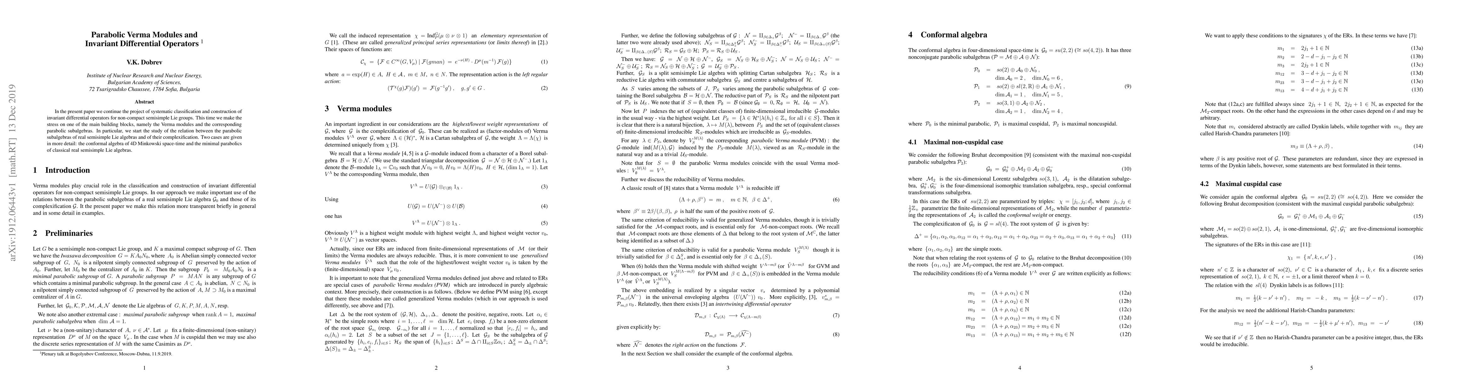 This paper classifies and constructs invariant differential operators for non-compact semisimple Lie groups, focusing on parabolic Verma modules and their subalgebras. It explores the relationship between parabolic subalgebras in real and complexified semisimple Lie algebras, with detailed studies on the conformal algebra of 4D Minkowski space-time and minimal parabolics.