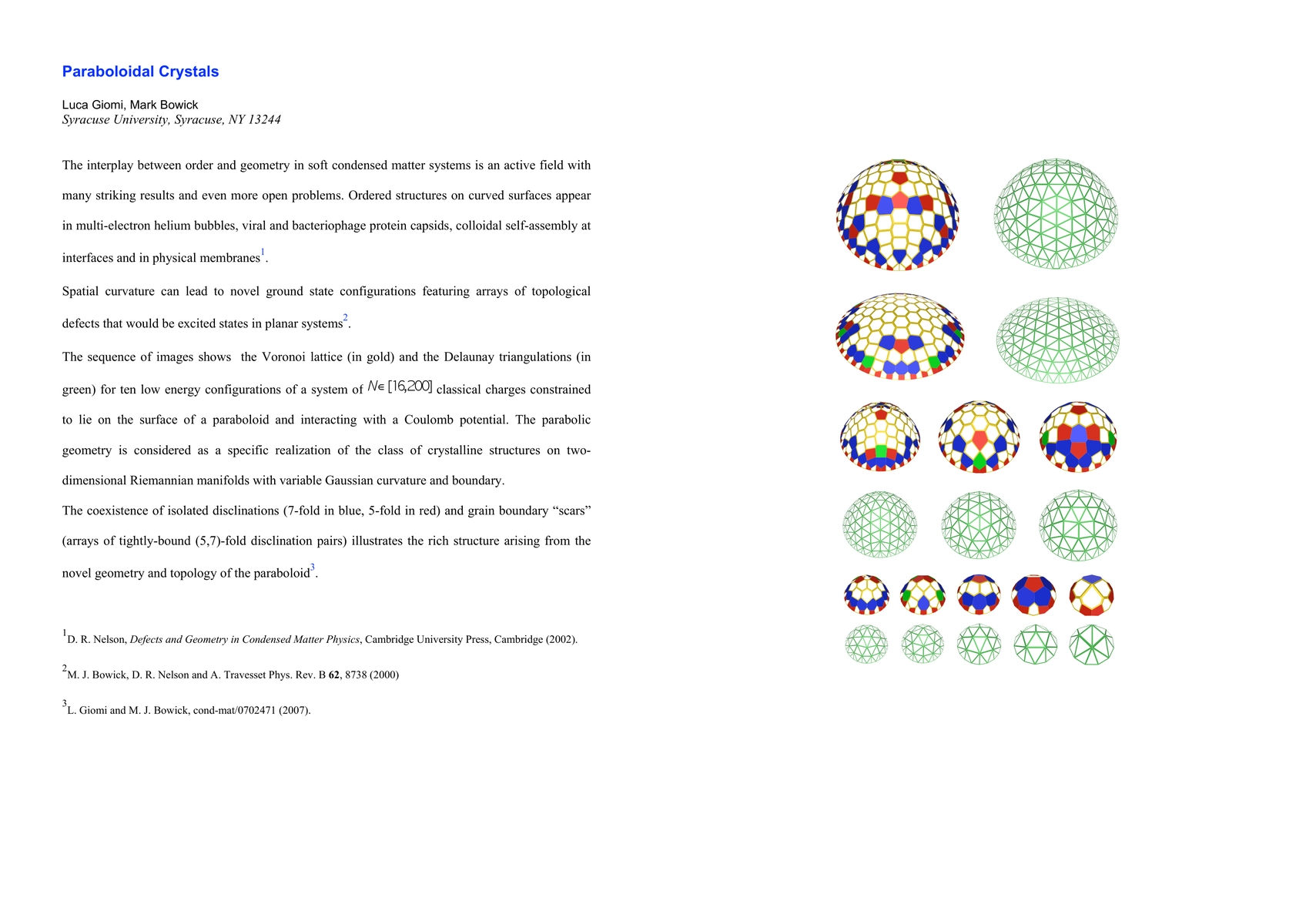 The interplay between order and geometry in soft condensed matter systems is an active field with many striking results and even more open problems. Ordered structures on curved surfaces appear in multi-electron helium bubbles, viral and bacteriophage protein capsids, colloidal self-assembly at interfaces and in physical membranes. Spatial curvature can lead to novel ground state configurations featuring arrays of topological defects that would be excited states in planar systems. We illustrate this with a sequence of images showing the Voronoi lattice (in gold) and the corresponding Delaunay triangulations (in green) for ten low energy configurations of a system of classical charges constrained to lie on the surface of a paraboloid and interacting with a Coulomb potential. The parabolic geometry is considered as a specific realization of the class of crystalline structures on two-dimensional Riemannian manifolds with variable Gaussian curvature and boundary.