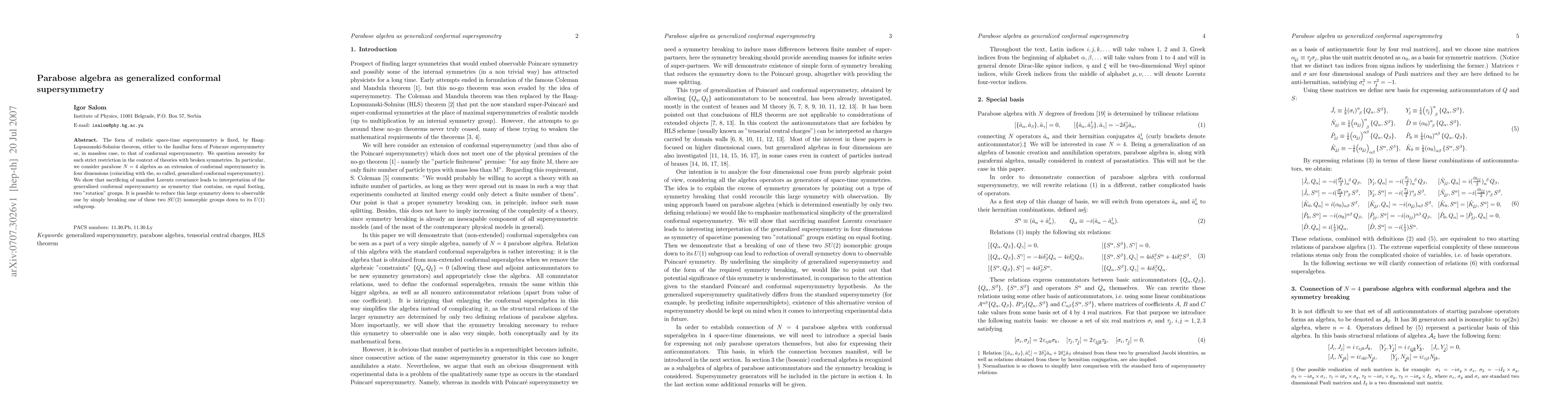 This paper explores the parabose N=4 algebra as an extension of conformal supersymmetry, proposing generalized conformal supersymmetry in four dimensions. It argues that breaking symmetries allows for a symmetry containing two "rotation" groups, which can be reduced to an observable symmetry by reducing one SU(2) group to its U(1) subgroup.