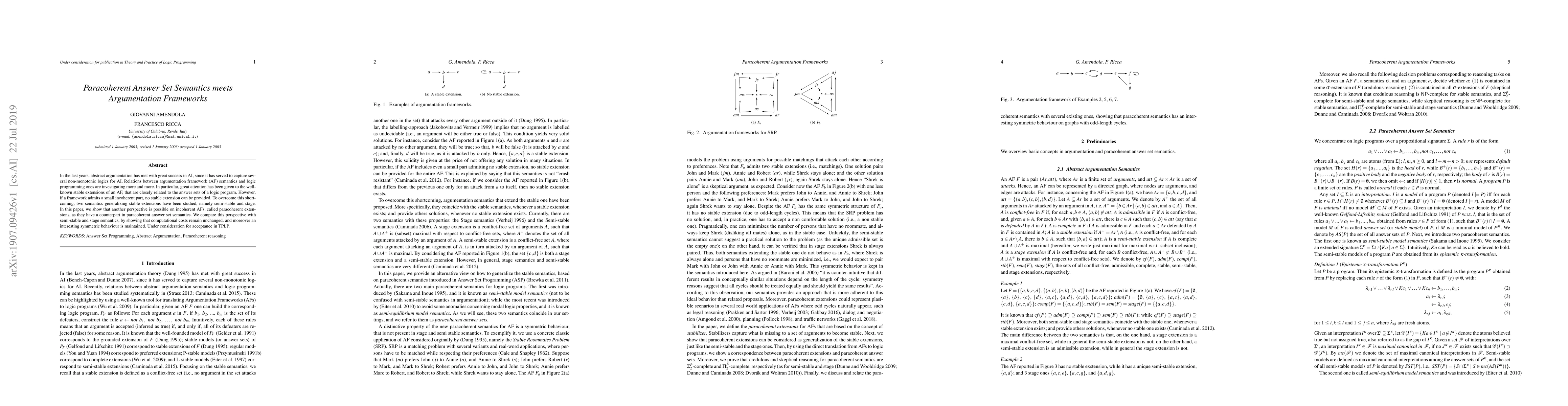 In the last years, abstract argumentation has met with great success in AI, since it has served to capture several non-monotonic logics for AI. Relations between argumentation framework (AF) semantics and logic programming ones are investigating more and more. In particular, great attention has been given to the well-known stable extensions of an AF, that are closely related to the answer sets of a logic program. However, if a framework admits a small incoherent part, no stable extension can be provided. To overcome this shortcoming, two semantics generalizing stable extensions have been studied, namely semi-stable and stage. In this paper, we show that another perspective is possible on incoherent AFs, called paracoherent extensions, as they have a counterpart in paracoherent answer set semantics. We compare this perspective with semi-stable and stage semantics, by showing that computational costs remain unchanged, and moreover an interesting symmetric behaviour is maintained. Under consideration for acceptance in TPLP.