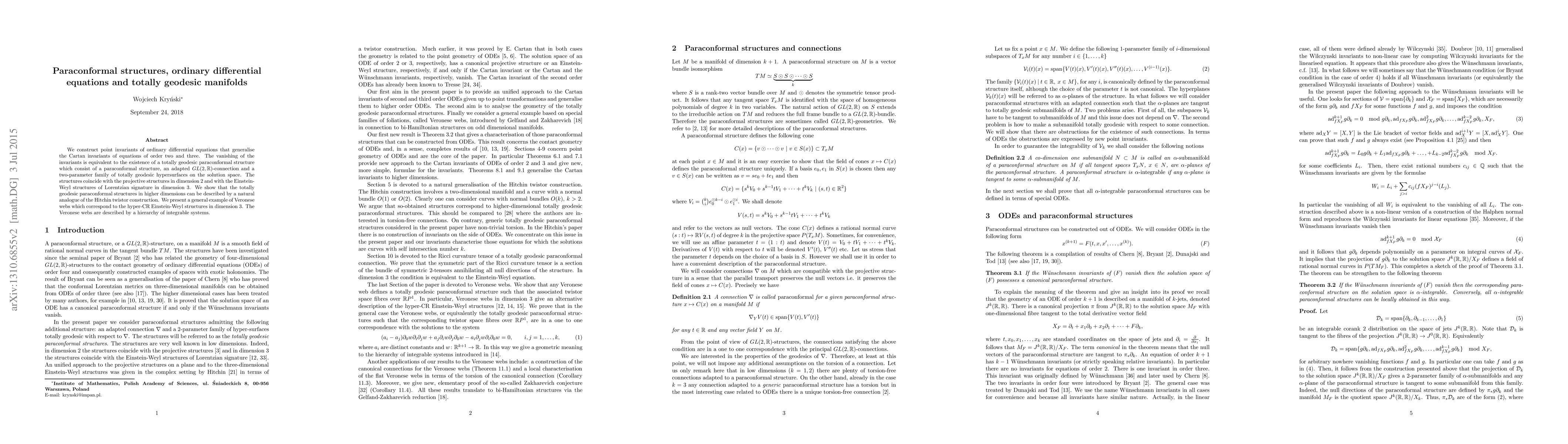 We construct point invariants of ordinary differential equations that generalise the Cartan invariants of equations of order two and three. The vanishing of the invariants is equivalent to the existence of a totally geodesic paraconformal structure which consist of a paraconformal structure, an adapted $GL(2,\R)$-connection and a two-parameter family of totally geodesic hypersurfaces on the solution space. The structures coincide with the projective structures in dimension 2 and with the Einstein-Weyl structures of Lorentzian signature in dimension 3. We show that the totally geodesic paraconformal structures in higher dimensions can be described by a natural analogue of the Hitchin twistor construction. We present a general example of Veronese webs which correspond to the hyper-CR Einstein-Weyl structures in dimension 3. The Veronese webs are described by a hierarchy of integrable systems.