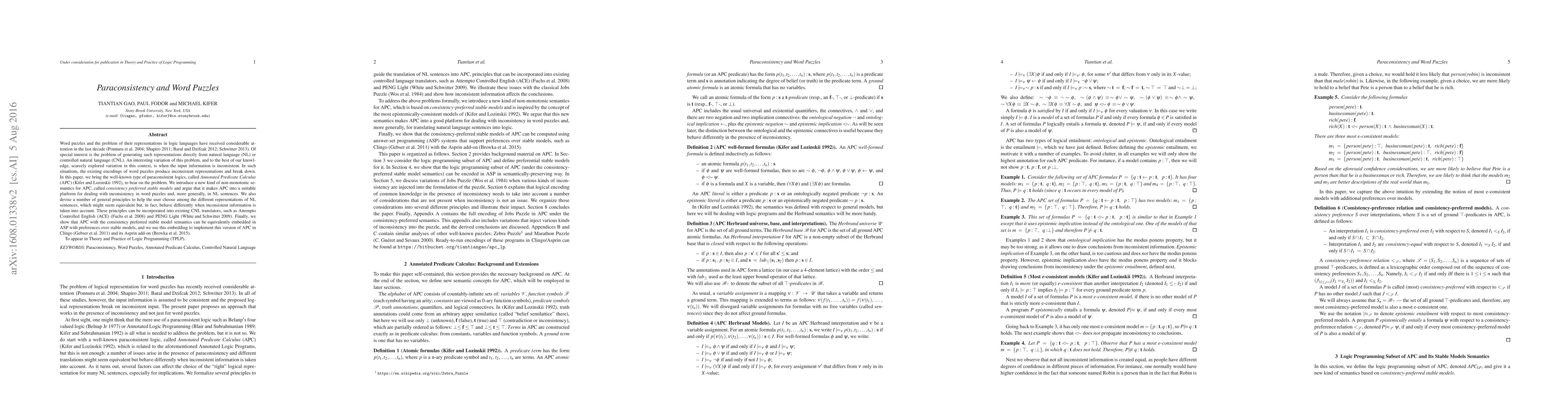 Word puzzles and the problem of their representations in logic languages have received considerable attention in the last decade (Ponnuru et al. 2004; Shapiro 2011; Baral and Dzifcak 2012; Schwitter 2013). Of special interest is the problem of generating such representations directly from natural language (NL) or controlled natural language (CNL). An interesting variation of this problem, and to the best of our knowledge, scarcely explored variation in this context, is when the input information is inconsistent. In such situations, the existing encodings of word puzzles produce inconsistent representations and break down. In this paper, we bring the well-known type of paraconsistent logics, called Annotated Predicate Calculus (APC) (Kifer and Lozinskii 1992), to bear on the problem. We introduce a new kind of non-monotonic semantics for APC, called consistency preferred stable models and argue that it makes APC into a suitable platform for dealing with inconsistency in word puzzles and, more generally, in NL sentences. We also devise a number of general principles to help the user choose among the different representations of NL sentences, which might seem equivalent but, in fact, behave differently when inconsistent information is taken into account. These principles can be incorporated into existing CNL translators, such as Attempto Controlled English (ACE) (Fuchs et al. 2008) and PENG Light (White and Schwitter 2009). Finally, we show that APC with the consistency preferred stable model semantics can be equivalently embedded in ASP with preferences over stable models, and we use this embedding to implement this version of APC in Clingo (Gebser et al. 2011) and its Asprin add-on (Brewka et al. 2015).