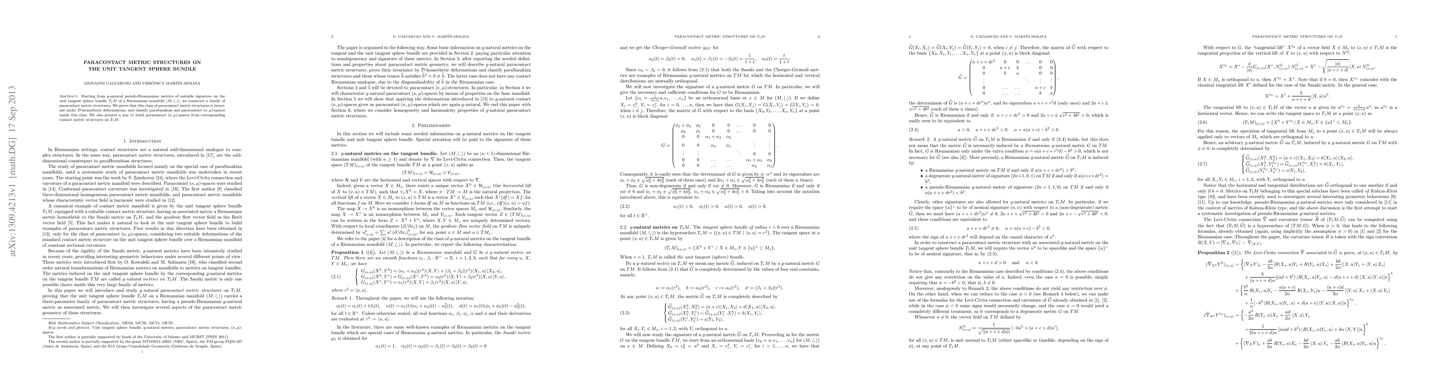 Starting from $g$-natural pseudo-Riemannian metrics of suitable signature on the unit tangent sphere bundle $T_1 M$ of a Riemannian manifold $(M,\langle,\rangle)$, we construct a family of paracontact metric structures. We prove that this class of paracontact metric structures is invariant under $\mathcal D$-homothetic deformations, and classify paraSasakian and paracontact $(\kappa,\mu)$-spaces inside this class. We also present a way to build paracontact $(\kappa,\mu)$-spaces from corresponding contact metric structures on $T_1 M$.
