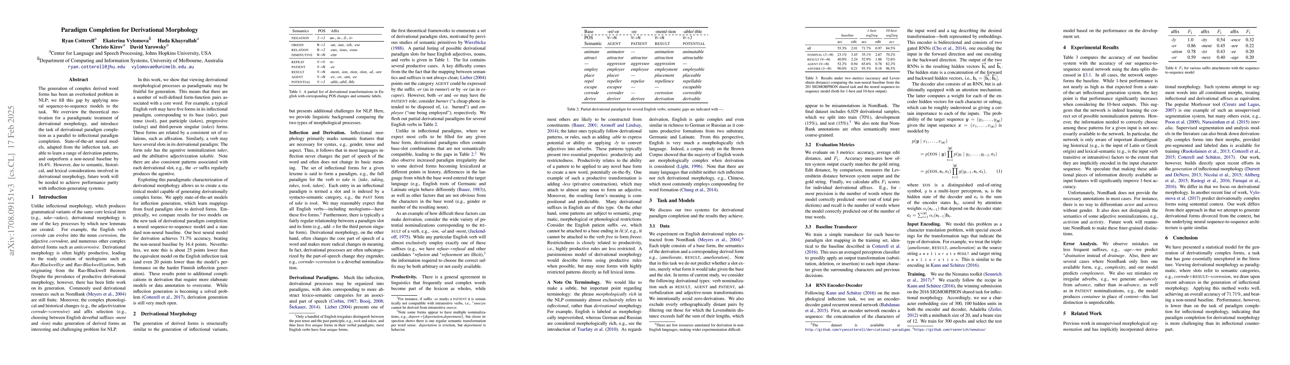 The generation of complex derived word forms has been an overlooked problem in NLP; we fill this gap by applying neural sequence-to-sequence models to the task. We overview the theoretical motivation for a paradigmatic treatment of derivational morphology, and introduce the task of derivational paradigm completion as a parallel to inflectional paradigm completion. State-of-the-art neural models, adapted from the inflection task, are able to learn a range of derivation patterns, and outperform a non-neural baseline by 16.4%. However, due to semantic, historical, and lexical considerations involved in derivational morphology, future work will be needed to achieve performance parity with inflection-generating systems.