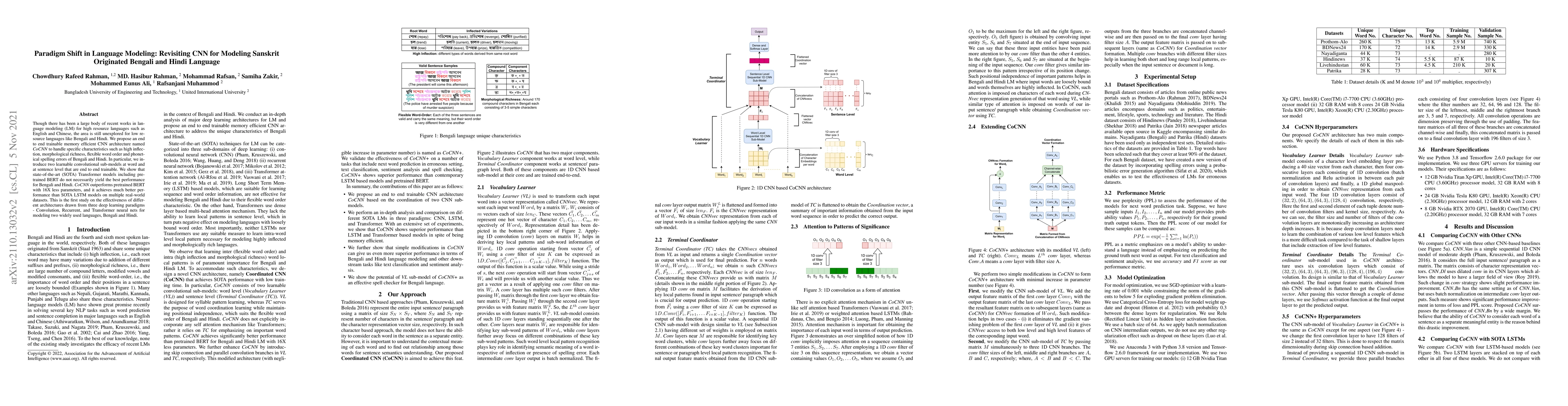 This paper proposes CoCNN, a memory-efficient CNN architecture for Bengali and Hindi language modeling, outperforming BERT and LSTM models. It highlights the effectiveness of convolutional sub-models at word and sentence levels, demonstrating superior performance on low-resource languages.