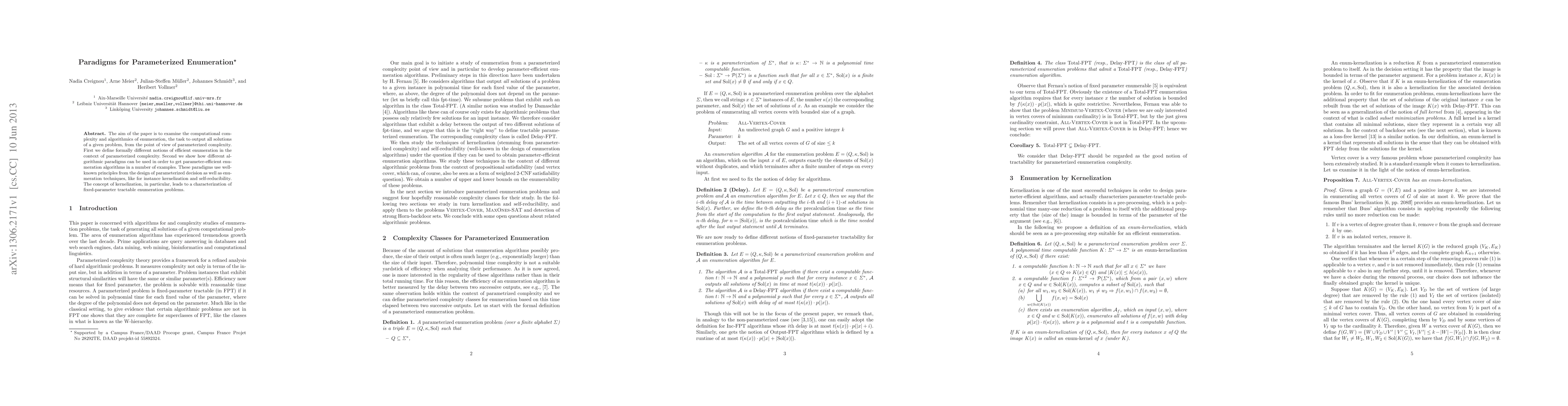 This paper explores the computational complexity and algorithmic strategies for enumeration problems within the framework of parameterized complexity. It defines efficient enumeration methods and demonstrates various algorithmic paradigms, including kernelization and self-reducibility, to achieve parameter-efficient enumeration algorithms.