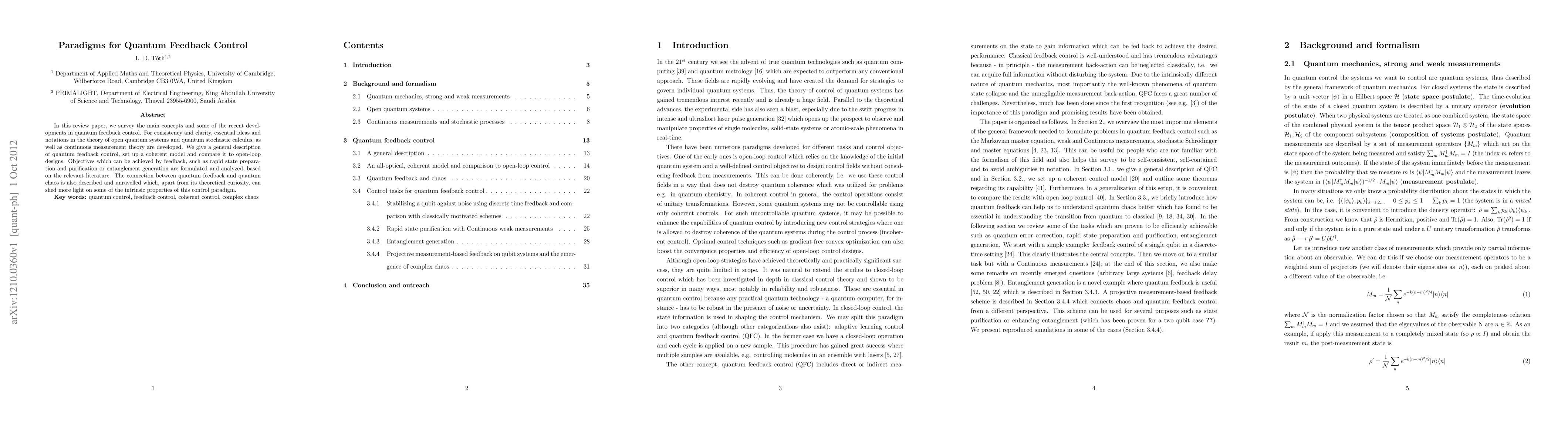 This review paper surveys recent advancements in quantum feedback control, detailing fundamental concepts and comparing feedback designs to open-loop systems. It explores objectives like rapid state preparation and entanglement generation, and discusses the intriguing connection between quantum feedback and quantum chaos.