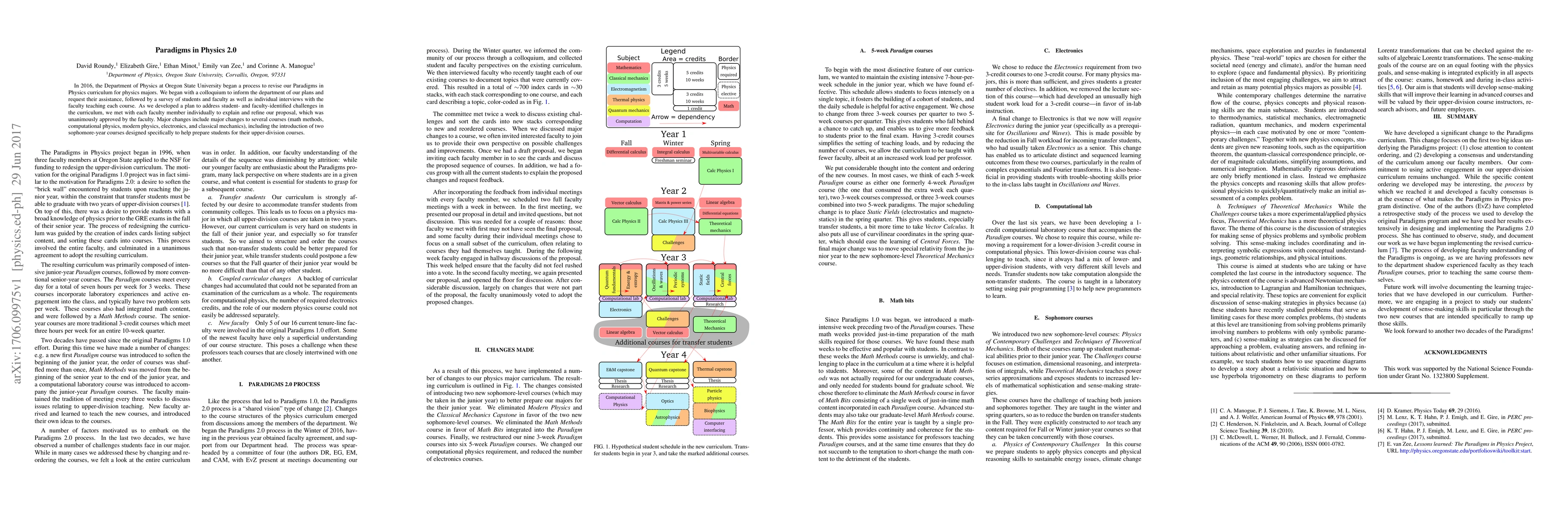 The Oregon State University Department of Physics revamped its Paradigms in Physics curriculum in 2016, involving faculty and students through surveys and interviews, leading to significant changes in several courses and the introduction of preparatory sophomore-year courses. The revised curriculum was unanimously approved by the faculty.