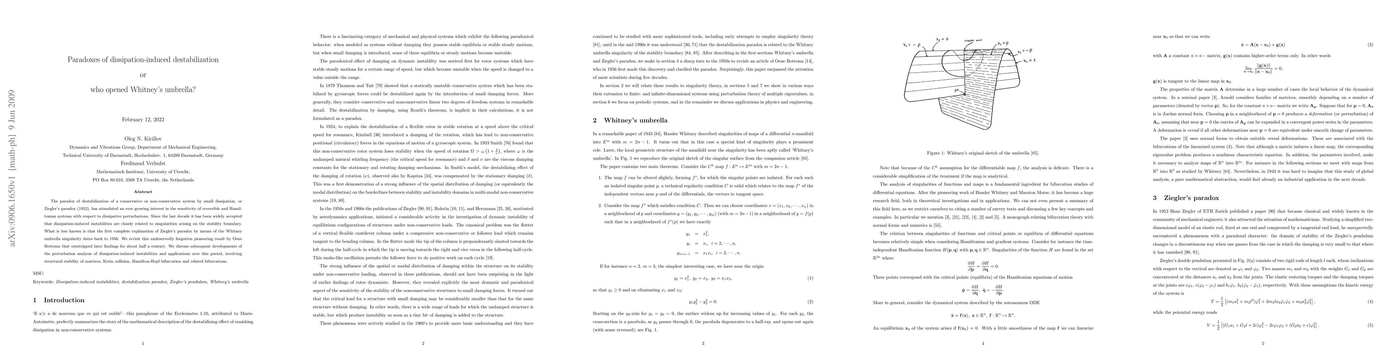 This paper revisits the 1956 explanation of Ziegler's paradox by Oene Bottema, which introduced the Whitney umbrella singularity to describe dissipation-induced destabilization in systems. It discusses the subsequent developments in the analysis of such instabilities and their applications over the past decades.